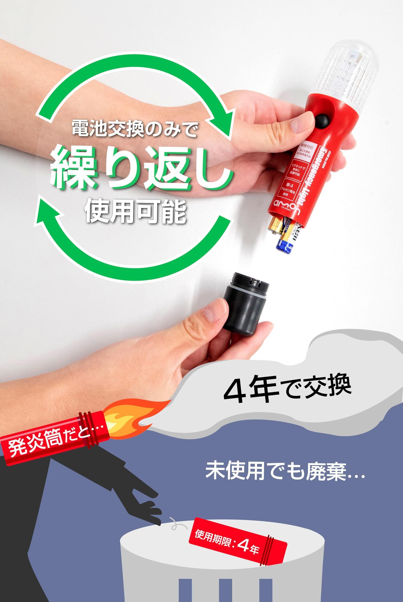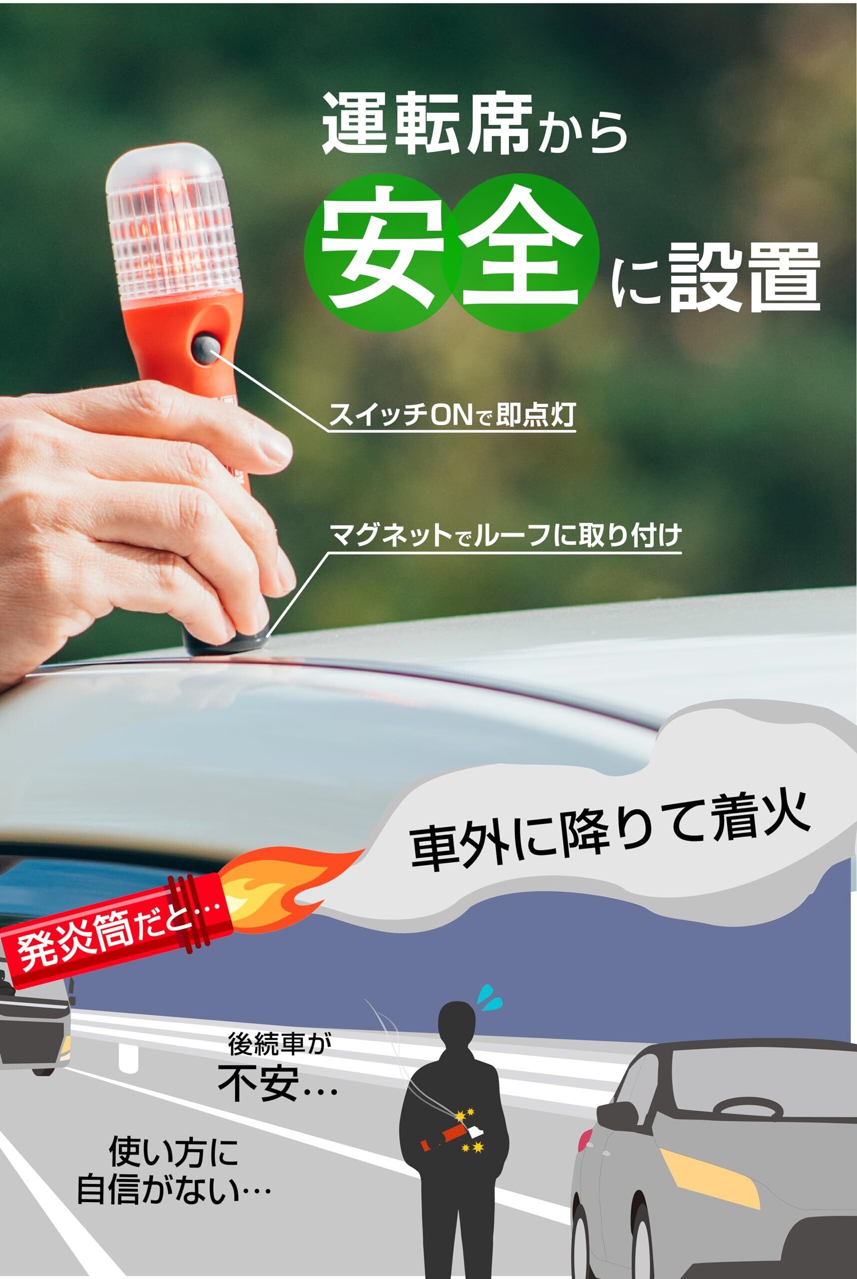 緊急停車時の二次的事故防止に。発炎筒の代わりに車載できる車検対応品。消費期限がなく、電池交換で繰り返し使える。夜間、約200m先からでも確認できる強力発光。連続使用約8時間(新品アルカリ電池を使用した場合)。緊急時でも直感的に操作しやすいスイッチ形状。マグネット付きで車内からでも設置できる。