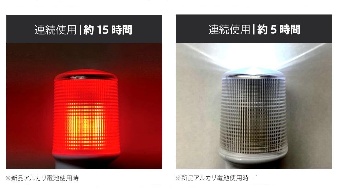 新品乾電池(アルカリ単四2本)の使用で連続点滅(赤)15時間以上が可能です。