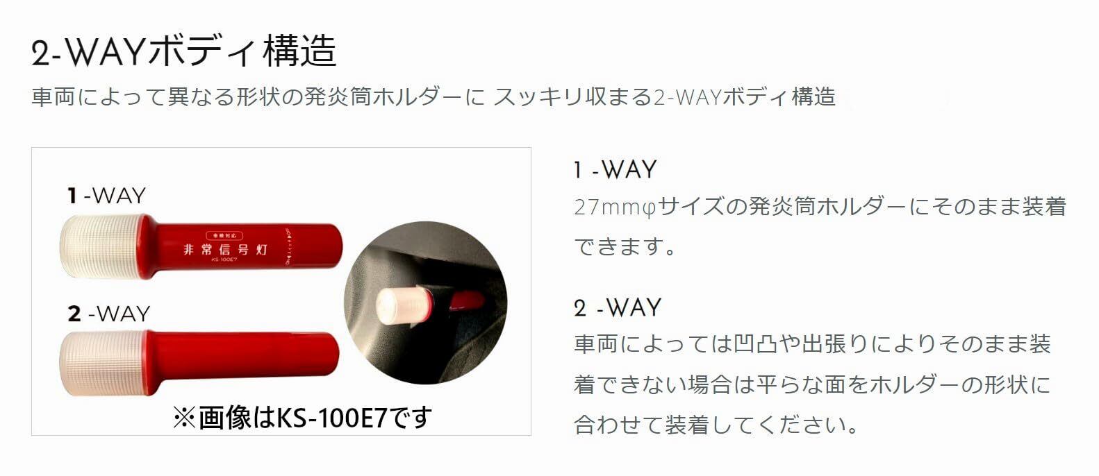 【2-WAYボディ構造】 1 -WAY:27mmφサイズの発炎筒ホルダーにそのまま装着できます。 2 -WAY:車両によっては凹凸や出張りによりそのまま装着できない場合は平らな面をホルダーの形状に合わせて装着してください。