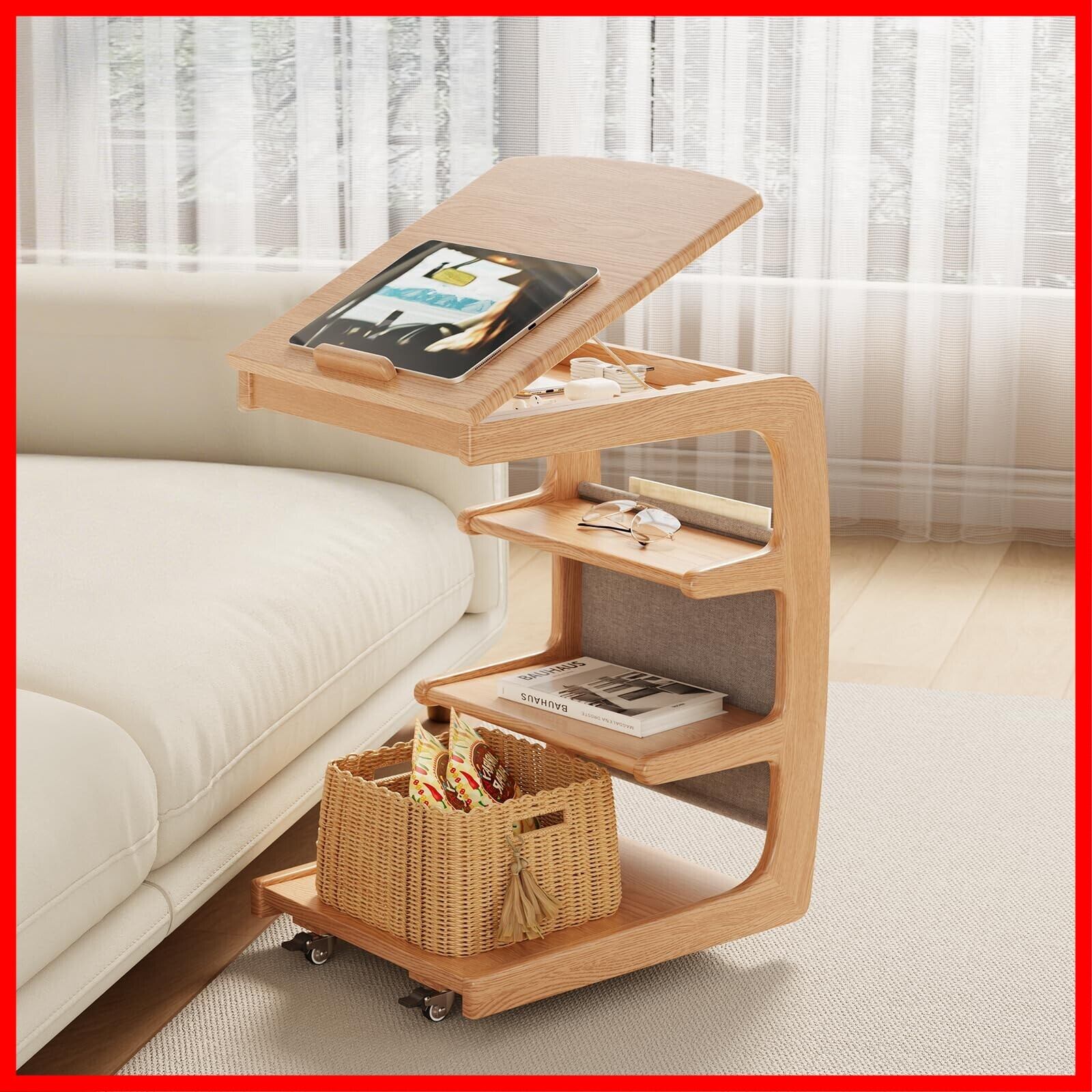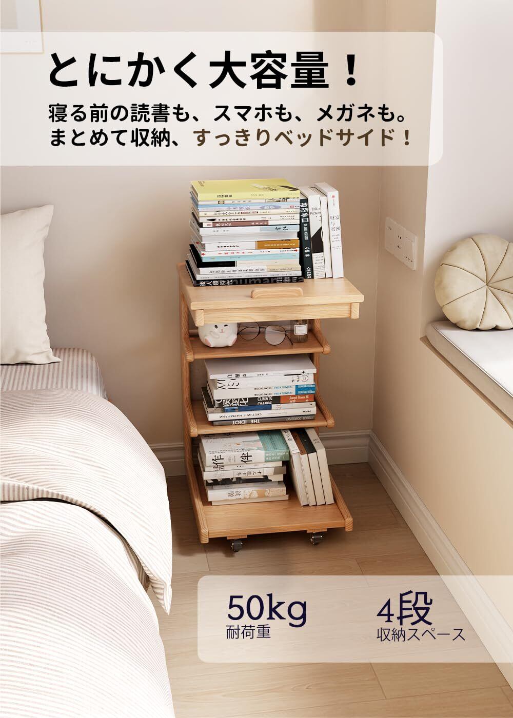 4階建て収納 | 天板で本を読みながら、そのすぐ下のこっそりトレイにメガネをしまい、さらに下の広々スペースに雑誌をゆとり収納。最後に底面ラックで季節のモノたちが息をひそめます。