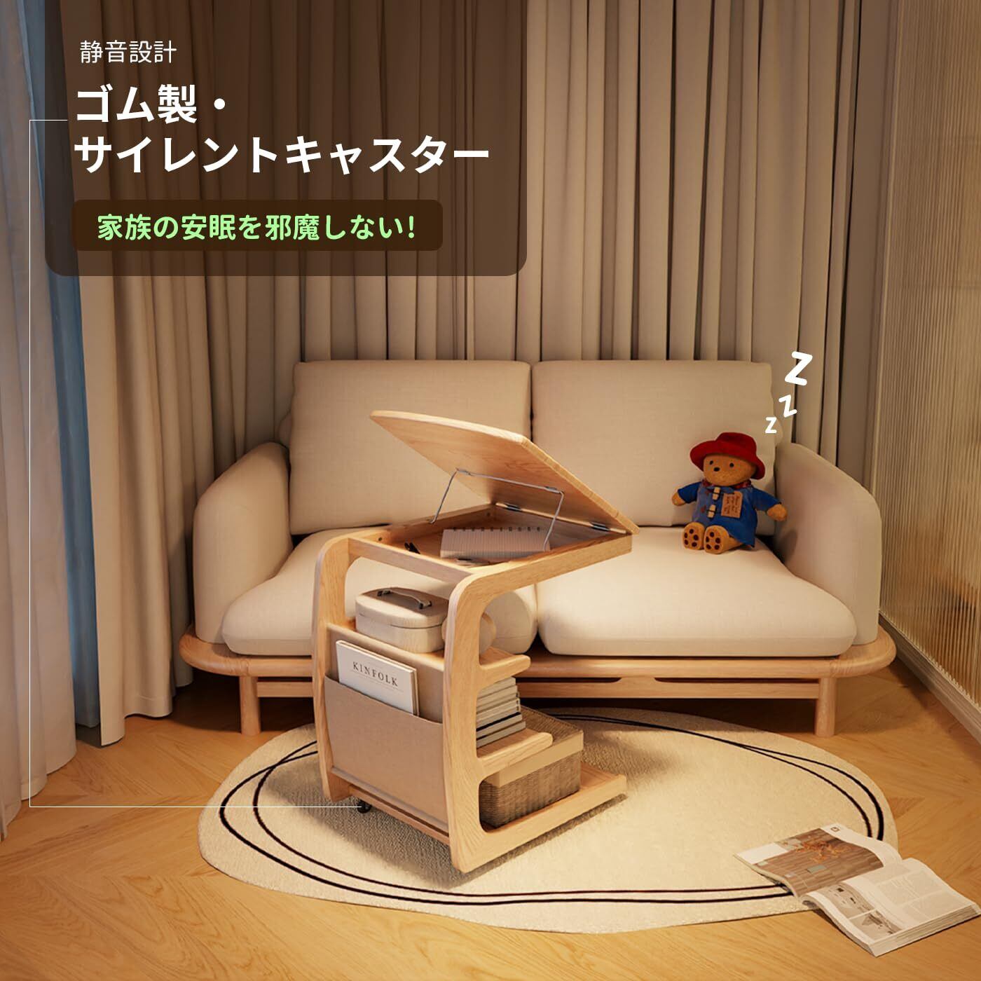 コの字フォルム | ソファの隙間へスッキリ収まる!リモコンも飲み物も手の届く距離に。家具に寄り添う曲線デザインが、リビングの快適空間を生み出します。