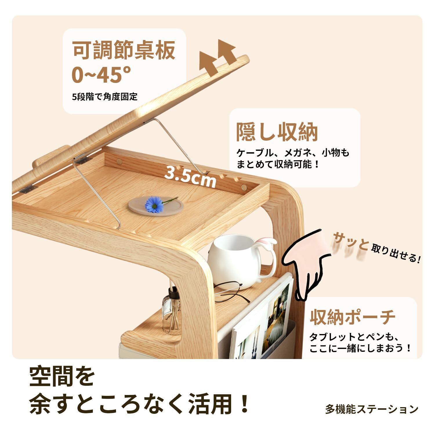 一枚の天板が広がる便利ワールド | 天板を45°まで傾ければ、タブレット映画や読書が楽しみやすい角度に。 その瞬間、天板と同じ広さの奥行き3.5cm隠しトレイが姿を現し、メガネや充電コードをすっと収納。
