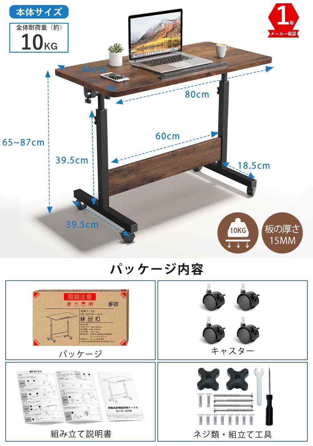 KUKERサイドテーブル キャスター付き 昇降式デスク 折りたたみデスク パソコンデスク ベッドサイドテーブル スタンディングデスク 介護用テーブル 移動式 オフィスデスク 高さ調節 幅80cm×奥行40cm×高さ65~87cm(ヴィンテージ)
