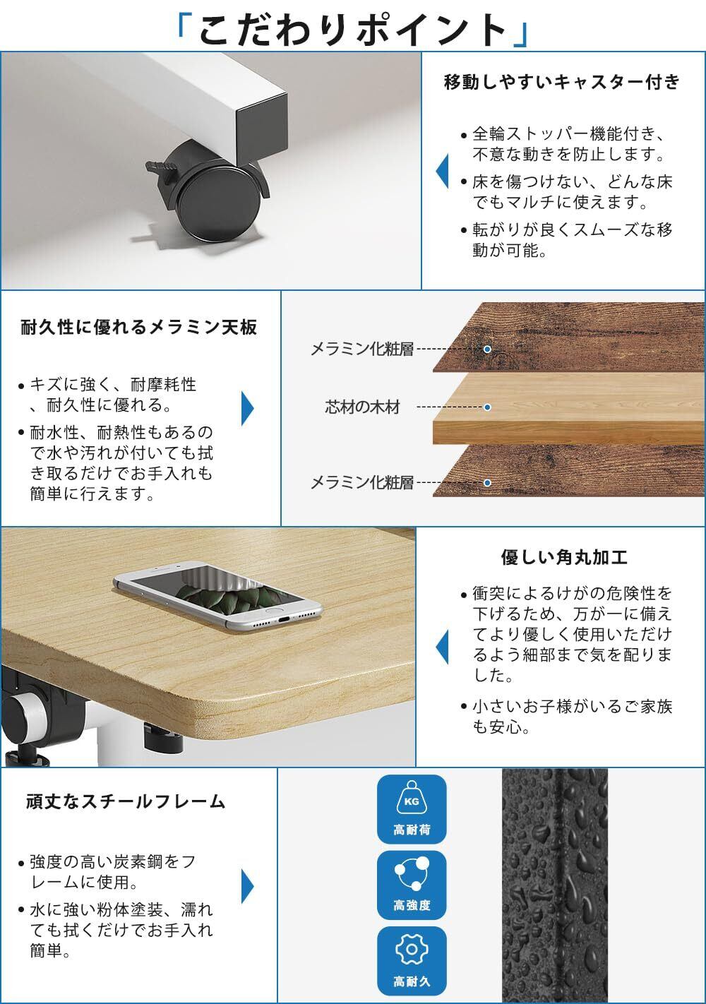 「高さ調節可能・キャスター付き」立っても座っても使えるスタンディングデスクです。無段階の調節が可能で、高さ約65~87cmの間で変更できます。移動が便利なキャスターは4つともストッパー機能付き、不意な動きを防ぎ、安定性に優れています。