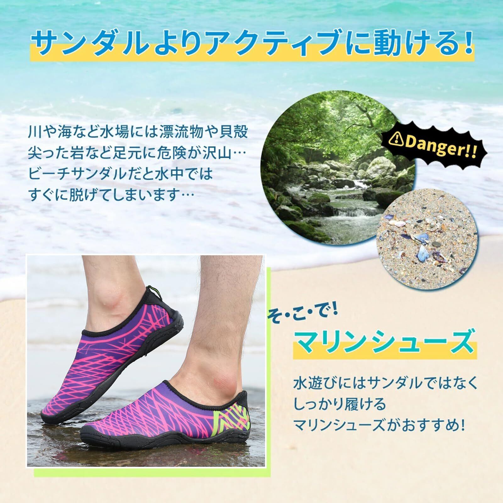 ケガや冷えから素足を守るマリンシューズ 登場。マリンシューズ(アクアシューズ)を履くことによって、岩場や磯、サンゴ礁帯のビーチ、砂浜など、足元の環境に関係なく安全にマリンレジャーを楽しむことが出来ます。また、シューズタイプはビーチサンダルのように簡単に脱げてしまうこともなく楽チンです。水陸両用ウェットスーツ素材の厚底タイプで岩場でも安心。シュノーケリングやマリンスポーツ、釣り、川遊びなどで使える大人気アイテム!旅行の持運びも楽々。ウオー夕ーアクティビティには必須のアイテム。水陸両用だから水遊びから普段使いまで大活躍。その場合は、マリンシューズ(ウォーターシューズ)やフィンソックスを履くことによって、 フィンズレを防止して、快適にシュノーケリングを楽しむことが出来ます。ダイビング シュノーケリング スキンダイビング サーフィン ボディーボード ウェイクボード ヨット ジェットスキー カヤック(シーカヤック・リバーカヤック) キャニオニング リバートレッキング パドルボード(SUP)などあらゆるマリンスポーツ キャンプ 海水浴 夏フェス バーベキュー プールなどのアウトドア&レジャー。
