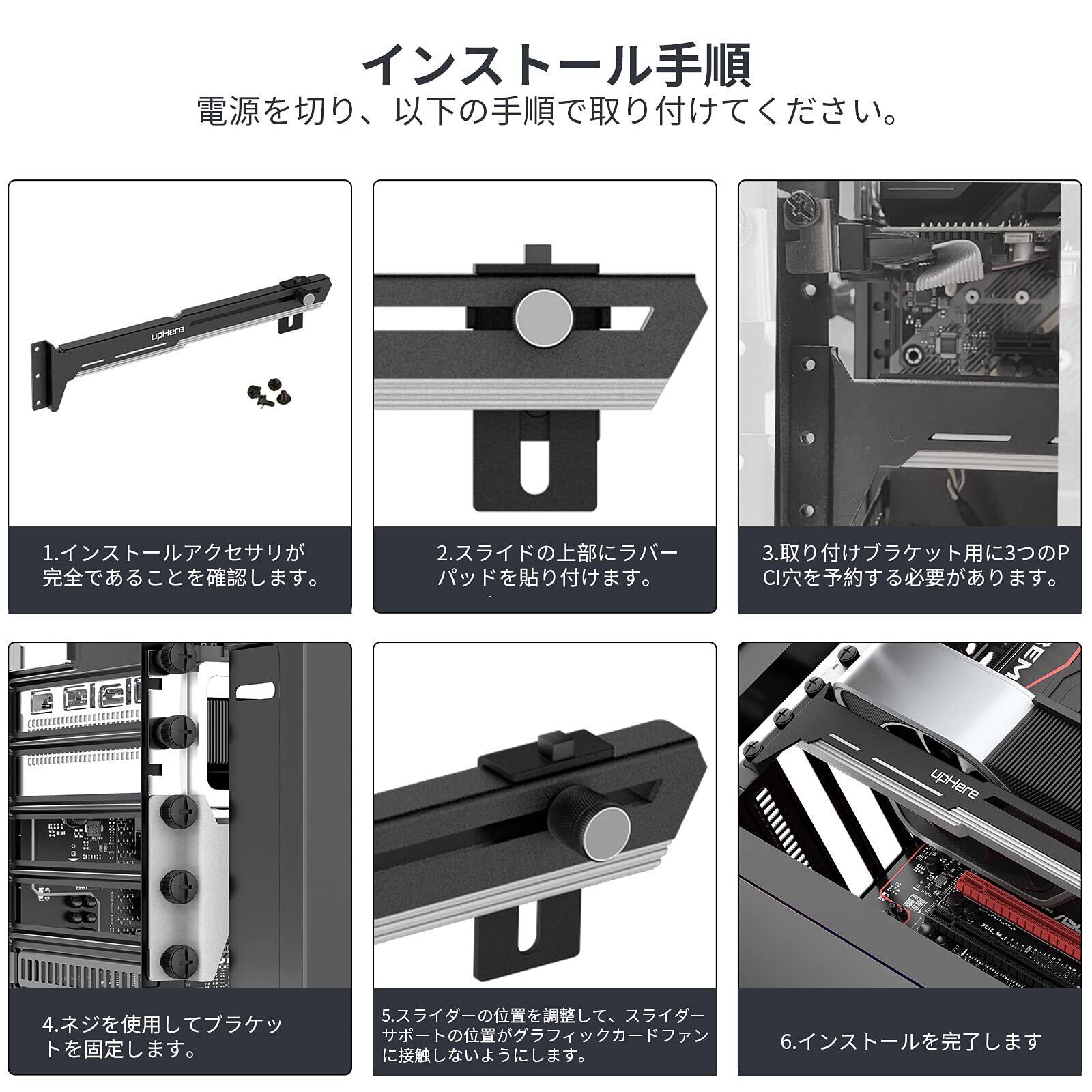 取付方法:1.上部にゴムパッドを貼り付けます。 2.PCI穴にネジ3本を入れてホルダーを固定します。 3.左右水平移動/上下スライドスタンドでGPUを固定します。 4.ホルダーの組立状態を確認し、しっかりと固定します。