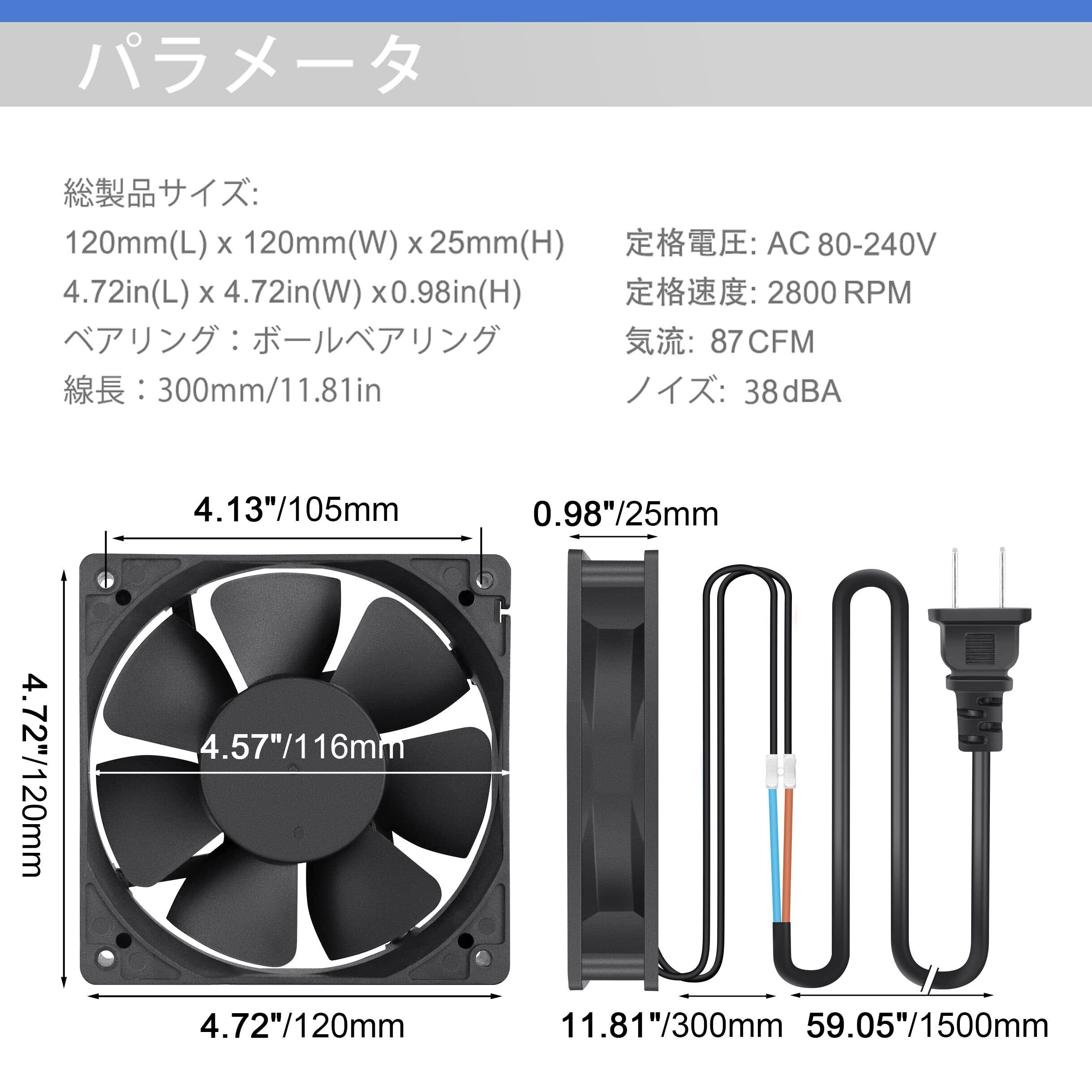 ❀パラメータ: 電圧: 100-240V AC | 速度: 2700RPM | エアフロー: 86.6CFM | 電力: 3W | ノイズ: 36dBA |