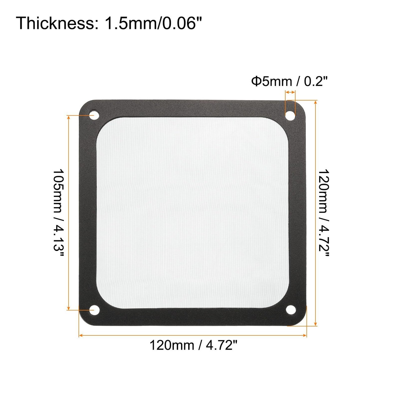 サイズ:120 x 120mm/4.72 x 4.72"(縦×横);穴の直径:5mm/0.2";穴の間隔:105mm/4.13";厚さ:1.5mm/0.06";カラー:黒;素材:ナイロンガーゼ;スタイル:角丸磁気グリル付き穴あり;パッケージに含まれるもの:3個のPCケースアクセサリー