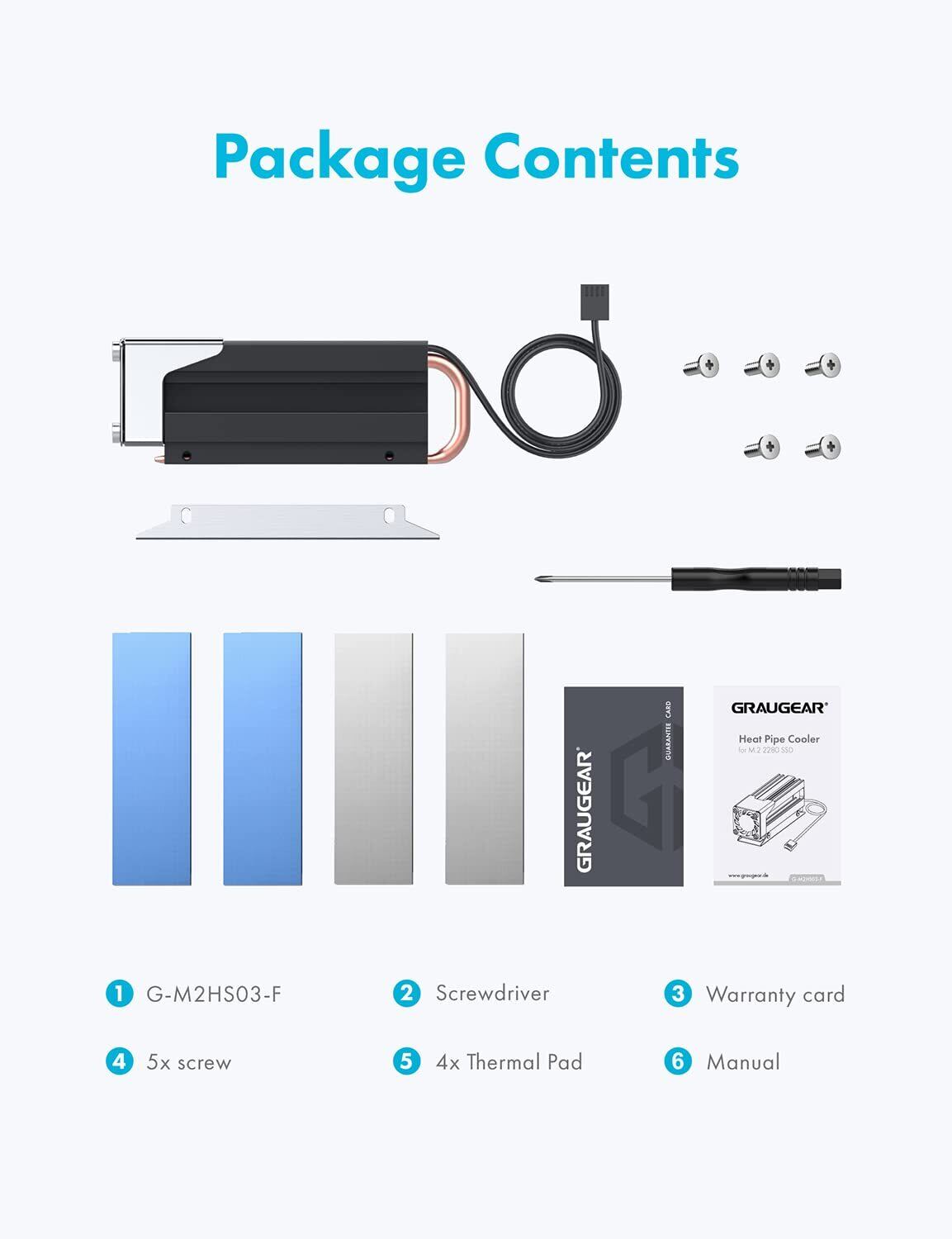 【付属品】GRAUGEAR M.2 2280 SSDヒートシンク、サーマルパッド4個、ドライバー、ネジ5個、書、取扱説明書。