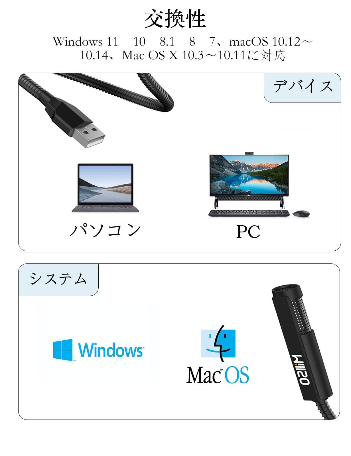 【優れた互換性、プラグ&プレイ】USB Aポートを搭載したほとんどのパソコンに対応できるUSBマイクです。Windows 11・10・8.1・8・7、macOS 10.12~10.14、Mac OS X 10.3~10.11、PS4/PS5に対応。複雑な設定をすることなく、マイクを挿せば使用可能。はじめての人でもすぐに使用できます。