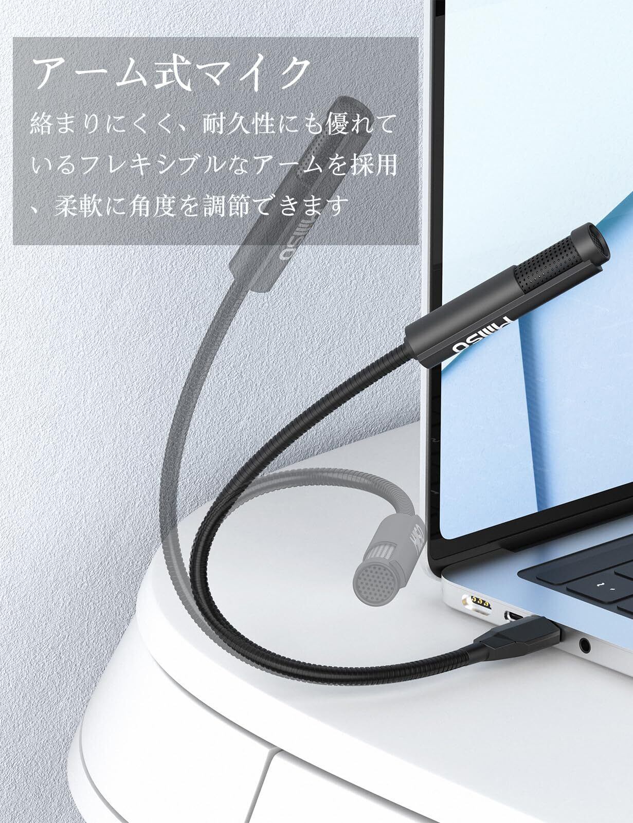 【シンプルな構造、フレキシブルアーム採用】当アーム式マイクはシンプルでスタイリッシュなデザインです。絡まりにくく、耐久性にも優れているフレキシブルなアームを採用、柔軟に角度を調節でき、さまざまに配置できます。