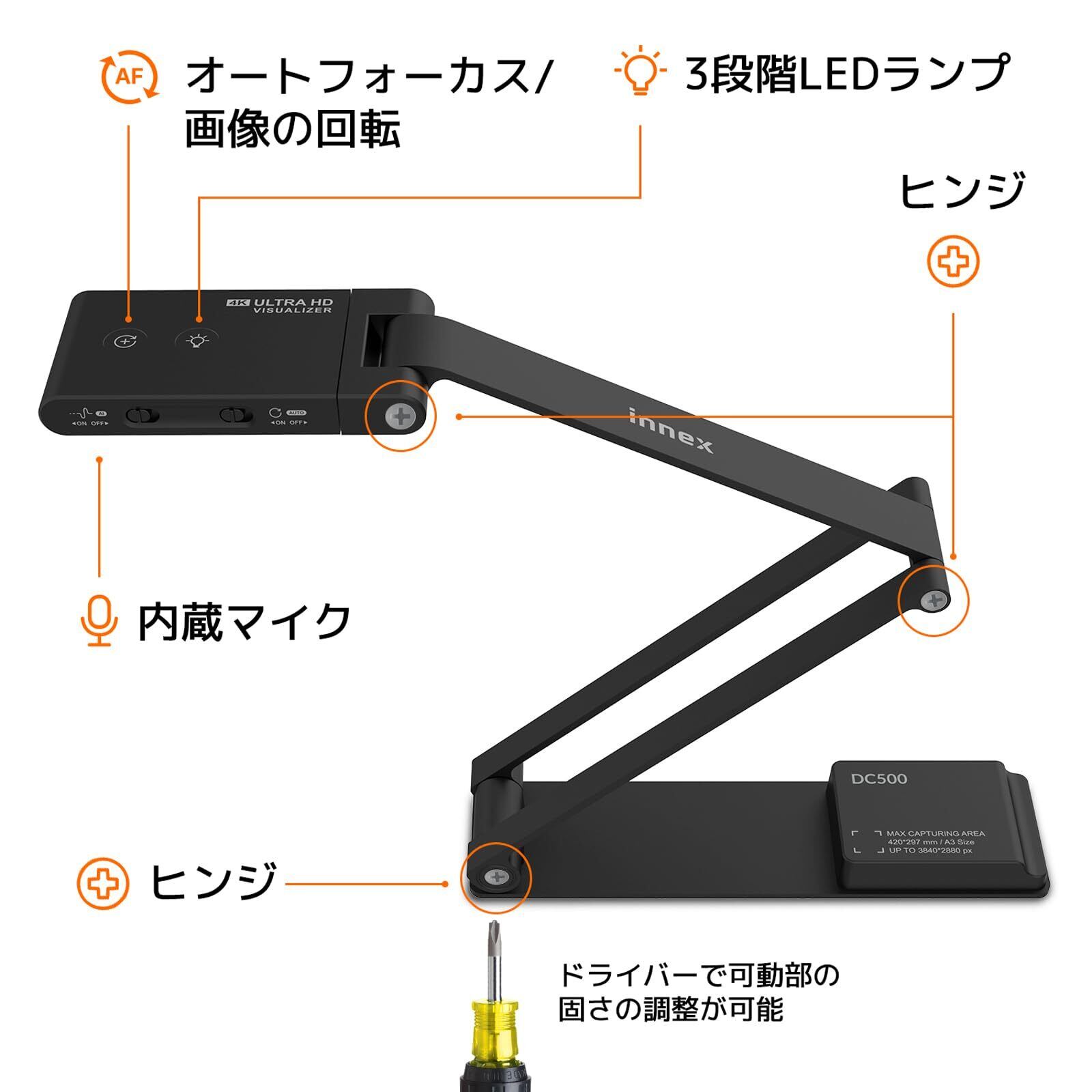 Innex DC500 USB Webカメラ/書画カメラ/スキャナー 3-in-1 1300万画素 4K/30fps & 1080P/60fps 2つのフォーカスモード A3サイズ&10cm近接投影 折りたたみ式ポータブル AIノイズ軽減マイク内蔵 Win/Mac/ChromeBook用 100言語+OCR プラグ&プレイ LEDランプ テレビ会議/オンラインレッスン/遠隔授業/ハイブリッド授業