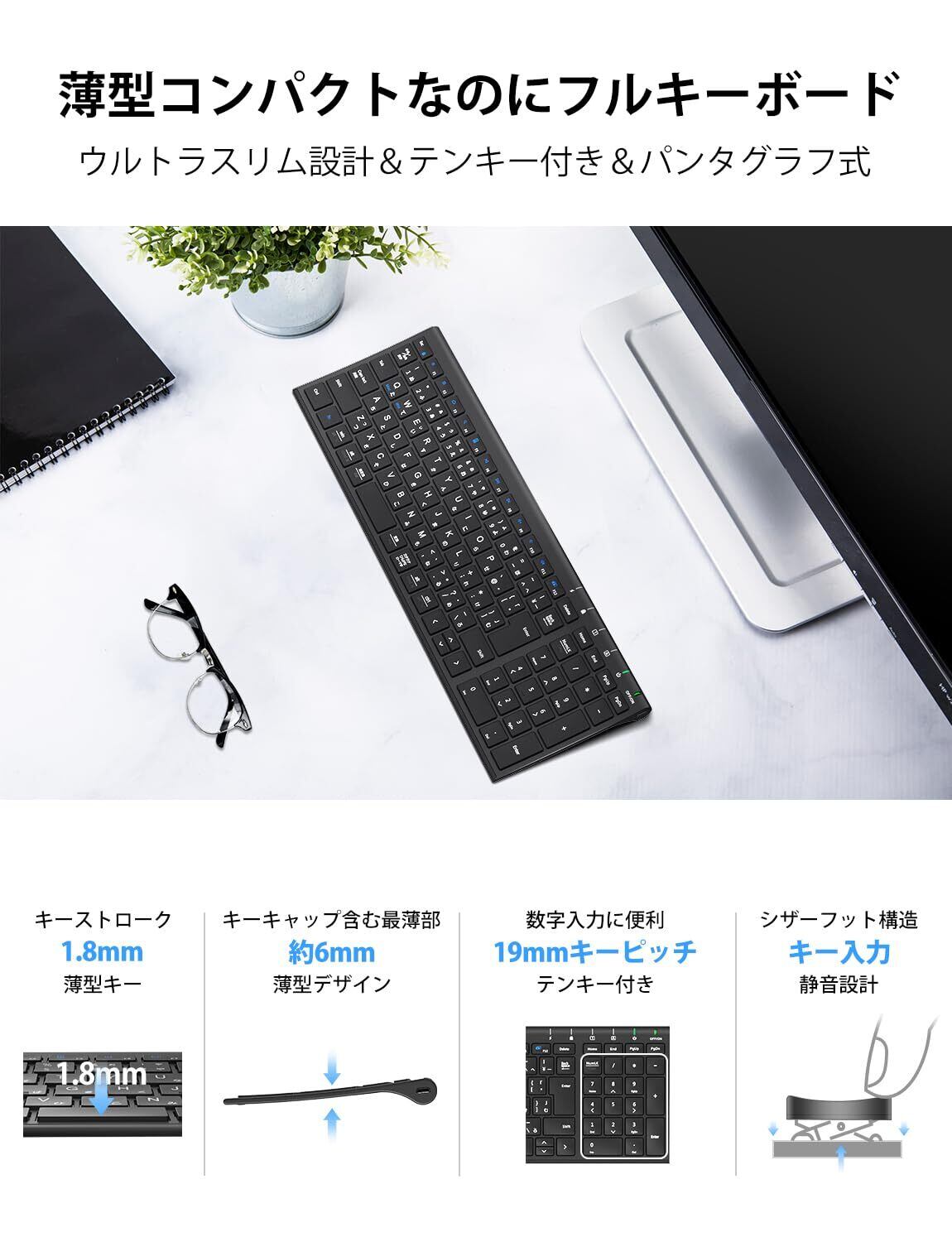 【幅広い互換性&薄型キーボード】Windows XP、Vista、Win 7、Win 8、Win 10または最新のWindowsと互換性があります。 PC、デスクトップ、ノードパソコンおよびラップトップで操作できます。3.95mm極薄の洗練されたボディ、シンプルでお洒落な外観、オフィスでも家でも使えます。本体寸法:36.6x12.5cm、キーボードの薄さ(奥1.6~手前0.3cm)が作業をスピードアップさせます。⁂本製品はご購入から18ヶ月の品質も付いております。ご購入後のご不明点等がございましたら、故障してしまった場合では、の購入履歴より店までご連絡いただければ対応させて頂きます。