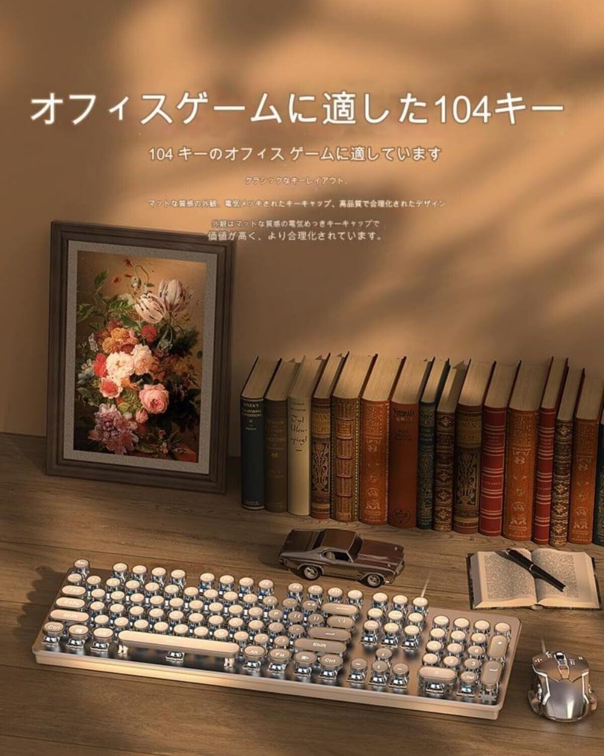 【人気商品】Conutooメカニカルゲーミングキーボードとマウスのコンボ、レトロスチームパンクヴィンテージタイプライタースタイルキーボード、LEDバックライト付き、104キーアンチゴーストブルースイッチ有線USBメタルパネルラウンドキーキャップ、ピンク (シルバーホワイト-ホワイトライト-黒軸+ゲーミングマクロマウス[有線キーボードとマウスのセット]) | Cherry Blossoms