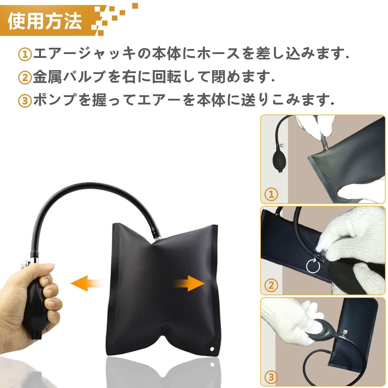 【使用簡単】ドアの隙間や内張りの隙間等に差込んで、ポンプでエアーを送って、膨らますだけで、外し たりこじ開けたり出来ます。ドアやウインドーを傷つけず解錠工具の差し込むすき間を作る用具です。