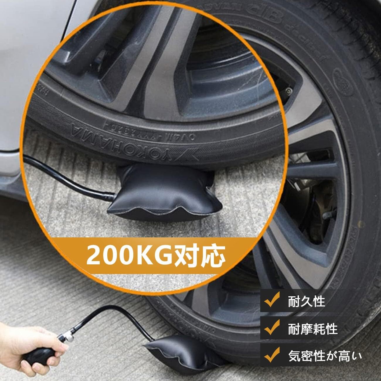 【商品情報】:サイズ:165mm*156mm、ホースの長さ:250mm、包装内容:エアージャッキ*4個、耐負荷約200kg。