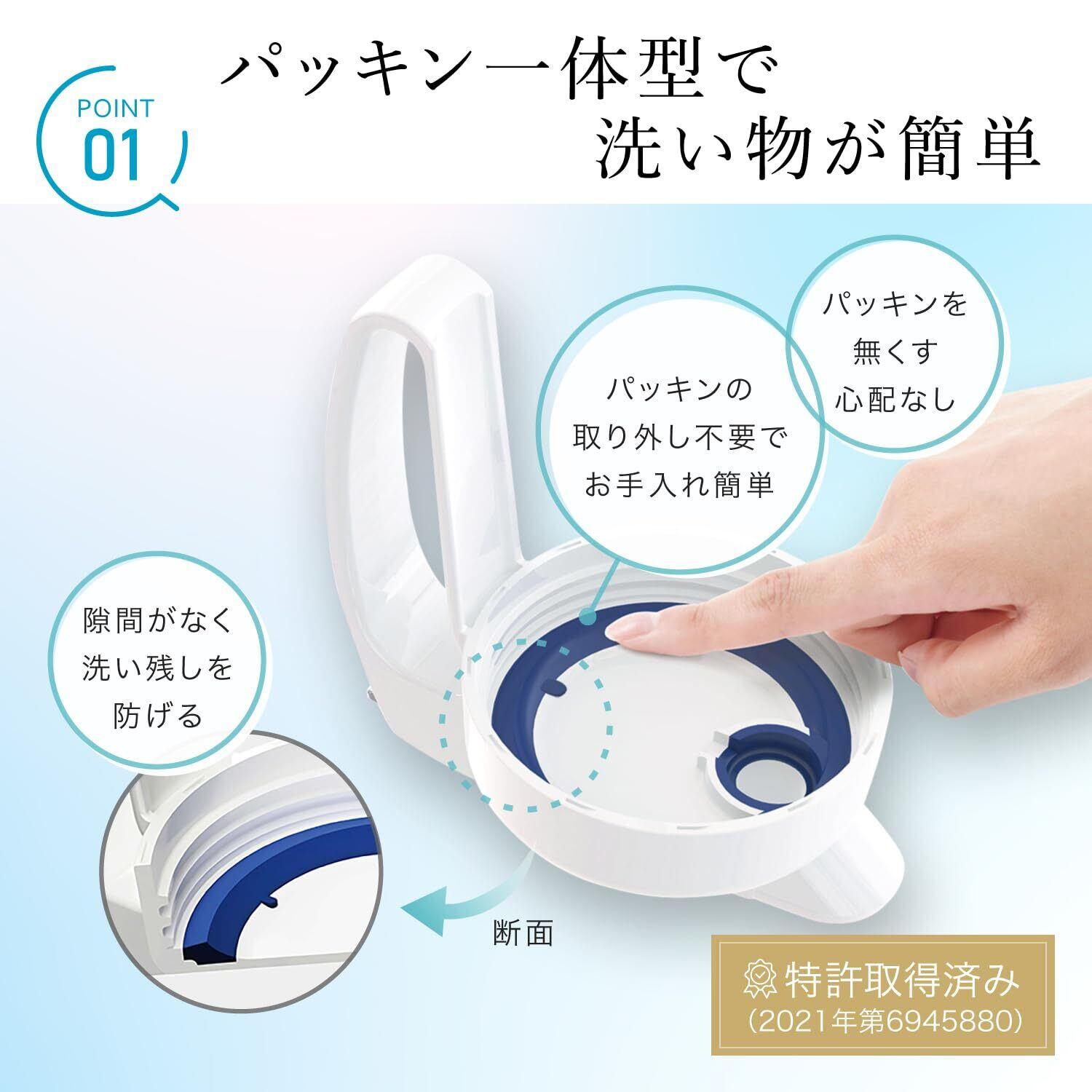 パッキンとフタが一体で、細かい手間を省けるお手入れしやすいシームレス構造