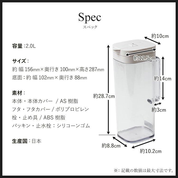 ワンプッシュオープン方式で手軽に注げる。冷蔵庫で横置きしても水漏れしない。スタイリッシュで、卓上にも映えるスクエア冷水筒。