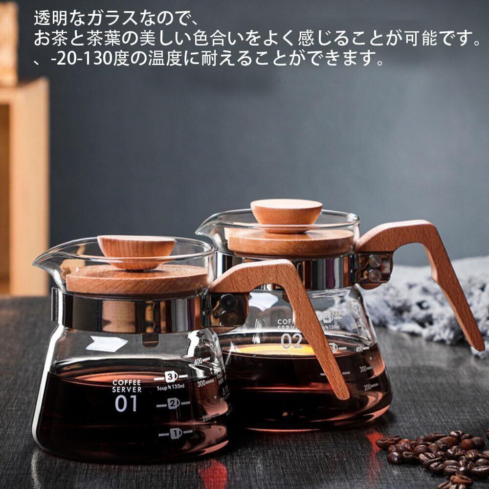 コーヒーサーバー 耐熱ガラス製 コーヒーポット ドリップポット ガラスティーポット 紅茶ポット 電子レンジ対応 耐久性 耐熱性 フタ付き オーク材製ハンドル 口が広い 食洗機対応 洗いやすい 多用途 会社 家族 会議用 (600ml)