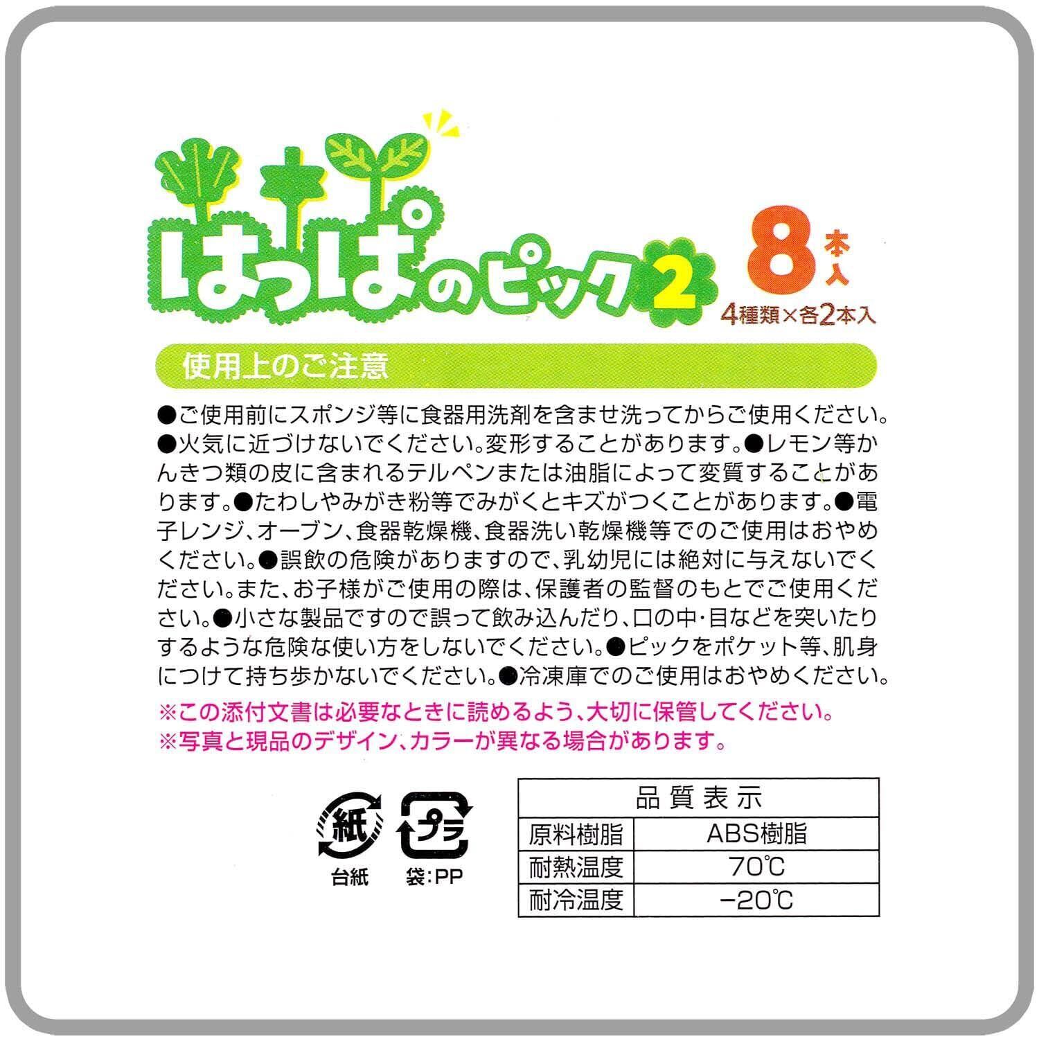 サイズ:トマト=約36×20×20mm、よつば=約30.5×29.5×29.5mm、ふたば=約39×28.5×4.5mm、ラディッシュ=約40×21×4mm、材質:ABS樹脂、耐熱温度:70度、耐冷温度:-20度、入数:8本(4種類×各2本)、生産国:中国