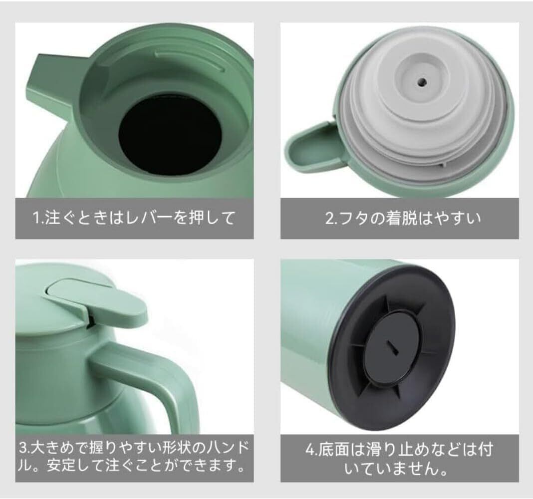 【お手入れ簡単】注ぎ口はプッシユレバ一式。フタに付いているレバ一を押し下げて傾けると飲み物を注ぐことができます。卓上ポットの蓋が外せるタイプで、片手でらくらく注げます。ワンタッチレバーで片手でもらくらくお手入れが非常に簡単です。