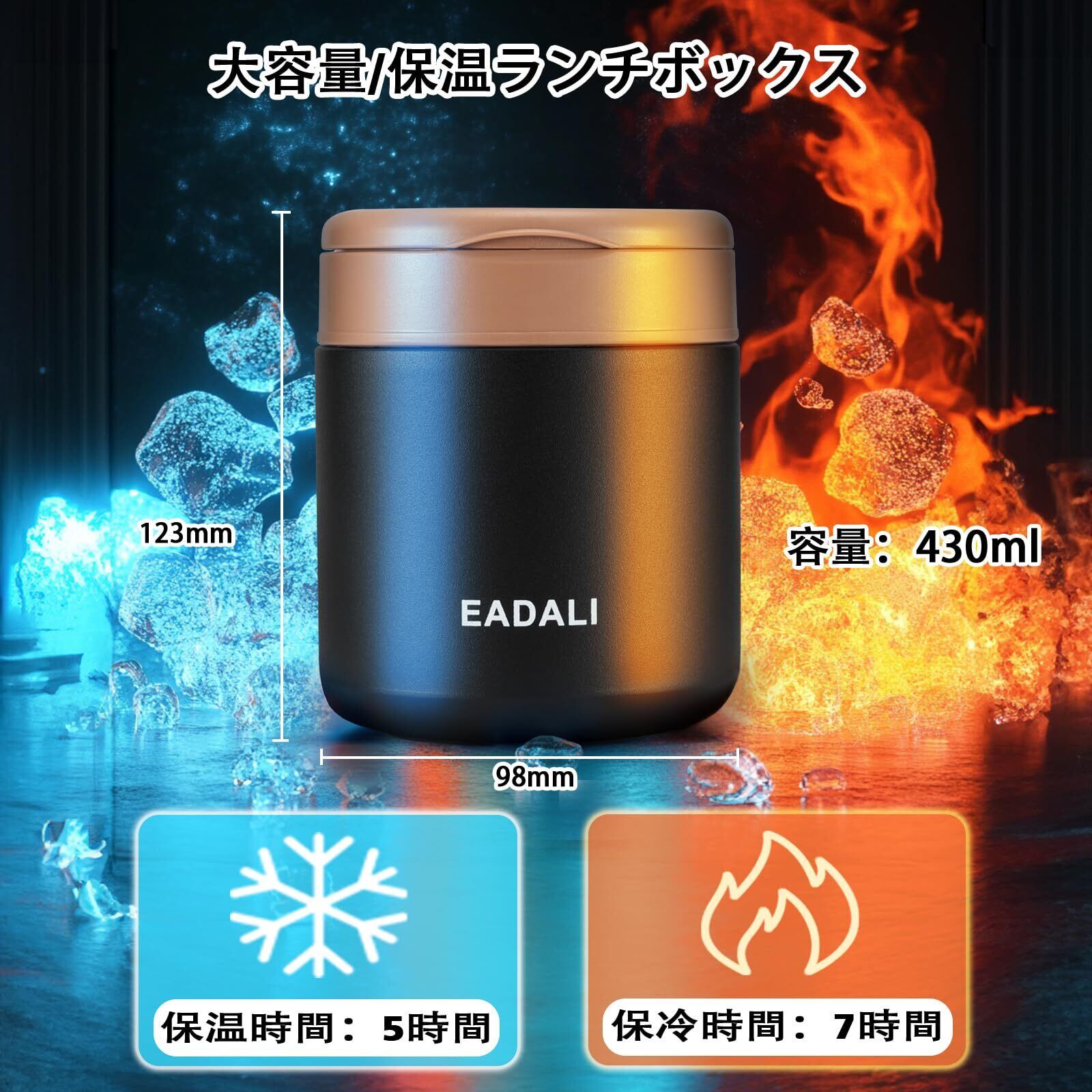 「EADALI 真空断熱構造 スープジャー」は、子供から大人まで幅広く利用できる、高機能なアイテムです。430mlの理想的な容量で、ブラックのシンプルなデザインが魅力。毎日のランチやお出かけ時に温かいスープや冷たい飲み物をしっかり保温・保冷できます!