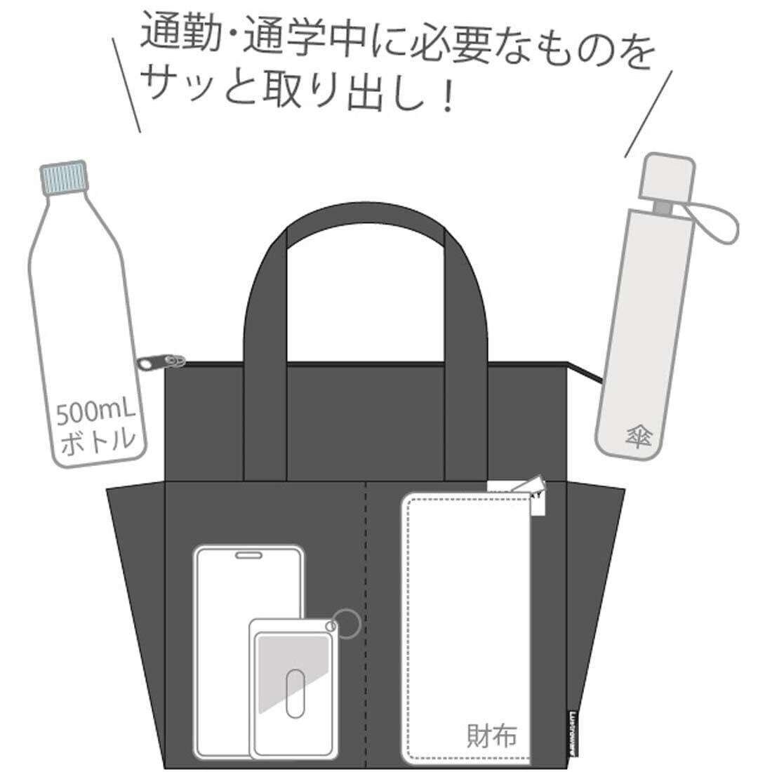 サッと取り出せる開口部は使い勝手が良く、持ち手もついているので持ち運びが楽々です。また、外側に付けられたポケットに小物を整理して収納でき、荷物も整頓可能。普段使いやレジャーにも最適です。