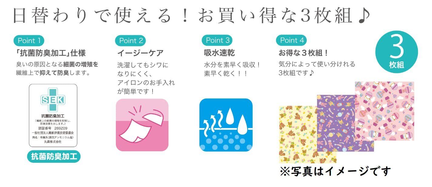 異なる柄のハンカチ3枚セットです。日替わりで柄違いを楽しめます。 抗菌防臭加工済みなので、嫌な臭いを防ぎ、繊維上の細菌の増殖を抑制します。