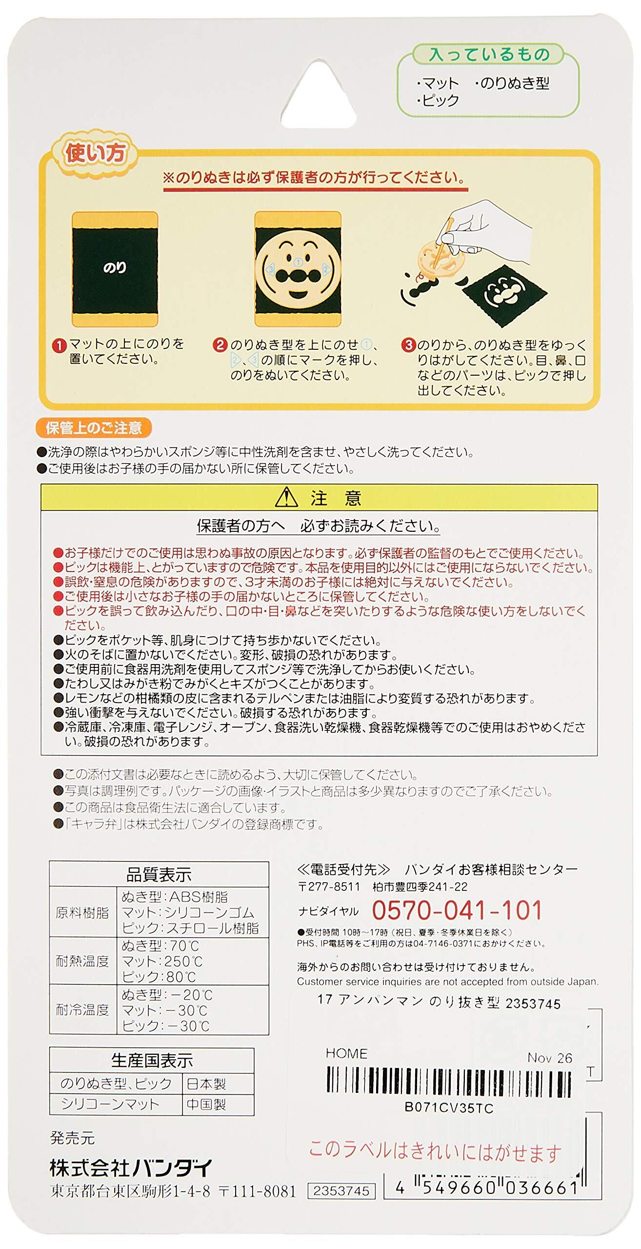 こののり抜き型を使えば、日本の伝説的キャラクター、アンパンマンのかたちをしたのりやおかずが簡単に作れます。おにぎりやサンドイッチに抜き型を使用して、お子さまの大好きなキャラをお弁当に盛り込むことができ、食事の時間を一段と楽しいものにします。