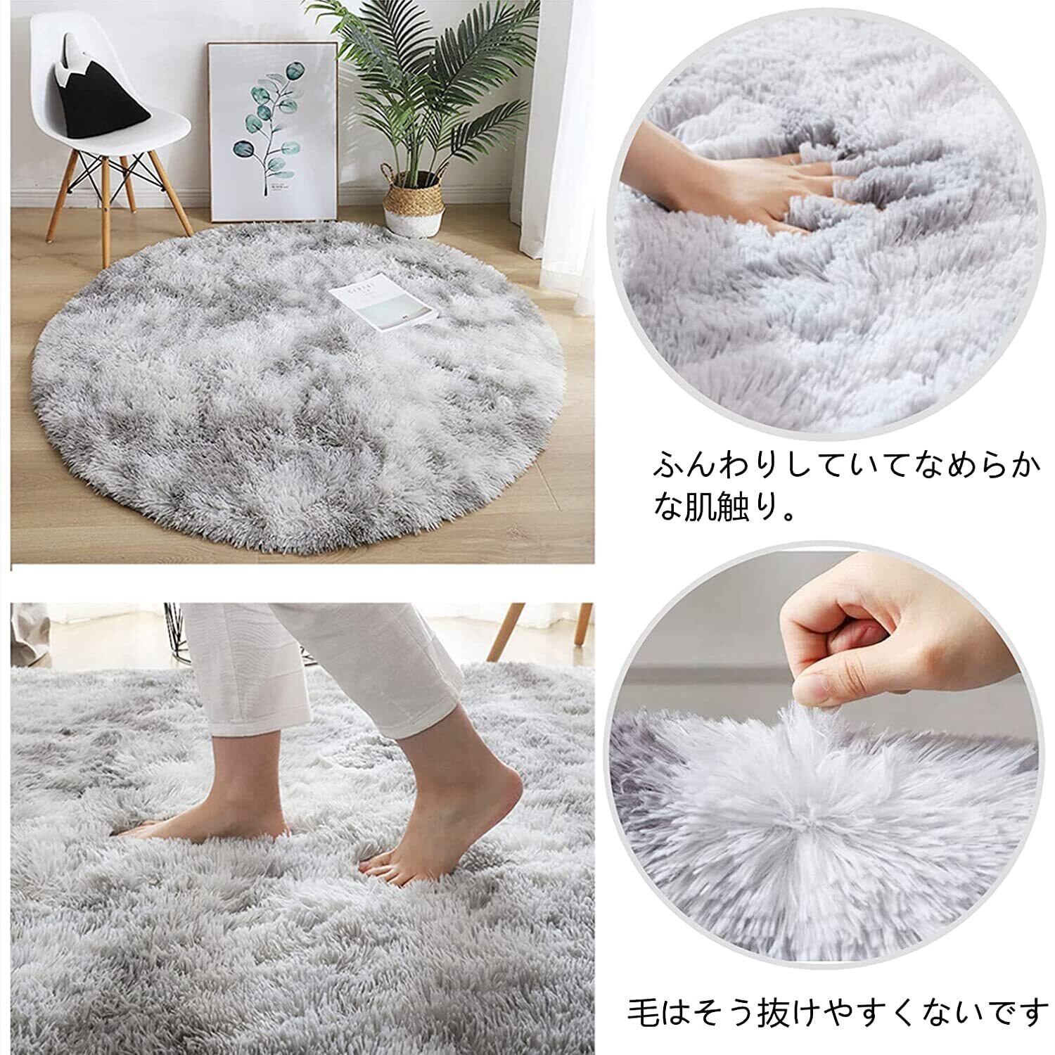 「Leesentec カーペット」は、直径100cmのコンパクトながらも存在感のある円形デザインで、リビングやベッドサイドにフィットします。優しいライトグレーの色合いが、お部屋を明るく演出し、北欧スタイルのインテリアとも調和します。ふわっとした手触りのシャギー素材は、素足での心地よさを感じさせ、足元を優しく包み込みます。