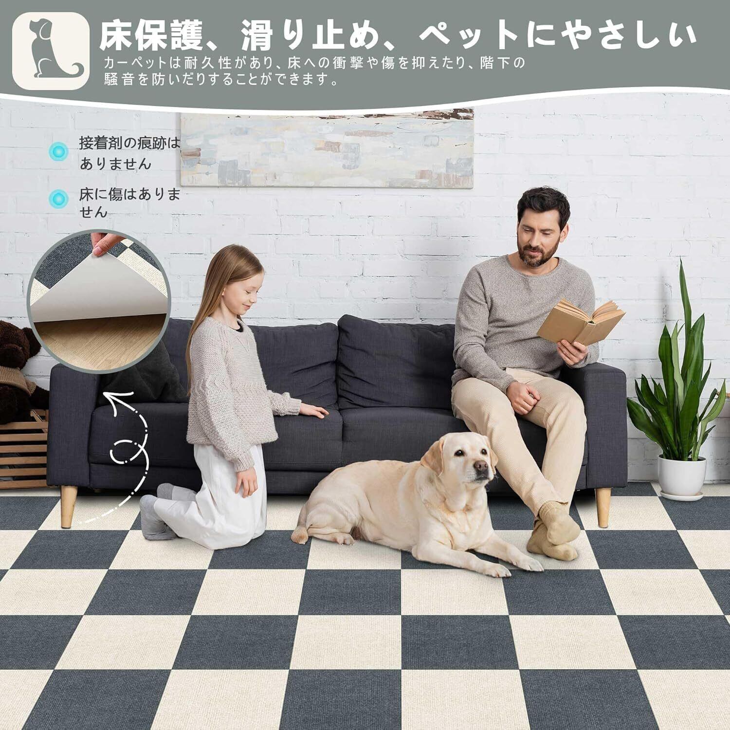 このタイルカーペットは特殊な吸着力を持つため、床の上にしっかり固定され、ペットや小さなお子様がいても安心です。防音性が高く、静かな環境を保ちます。さらに、洗える仕様なので、汚れても手軽にお手入れが可能で、常に清潔さを保つことができます。