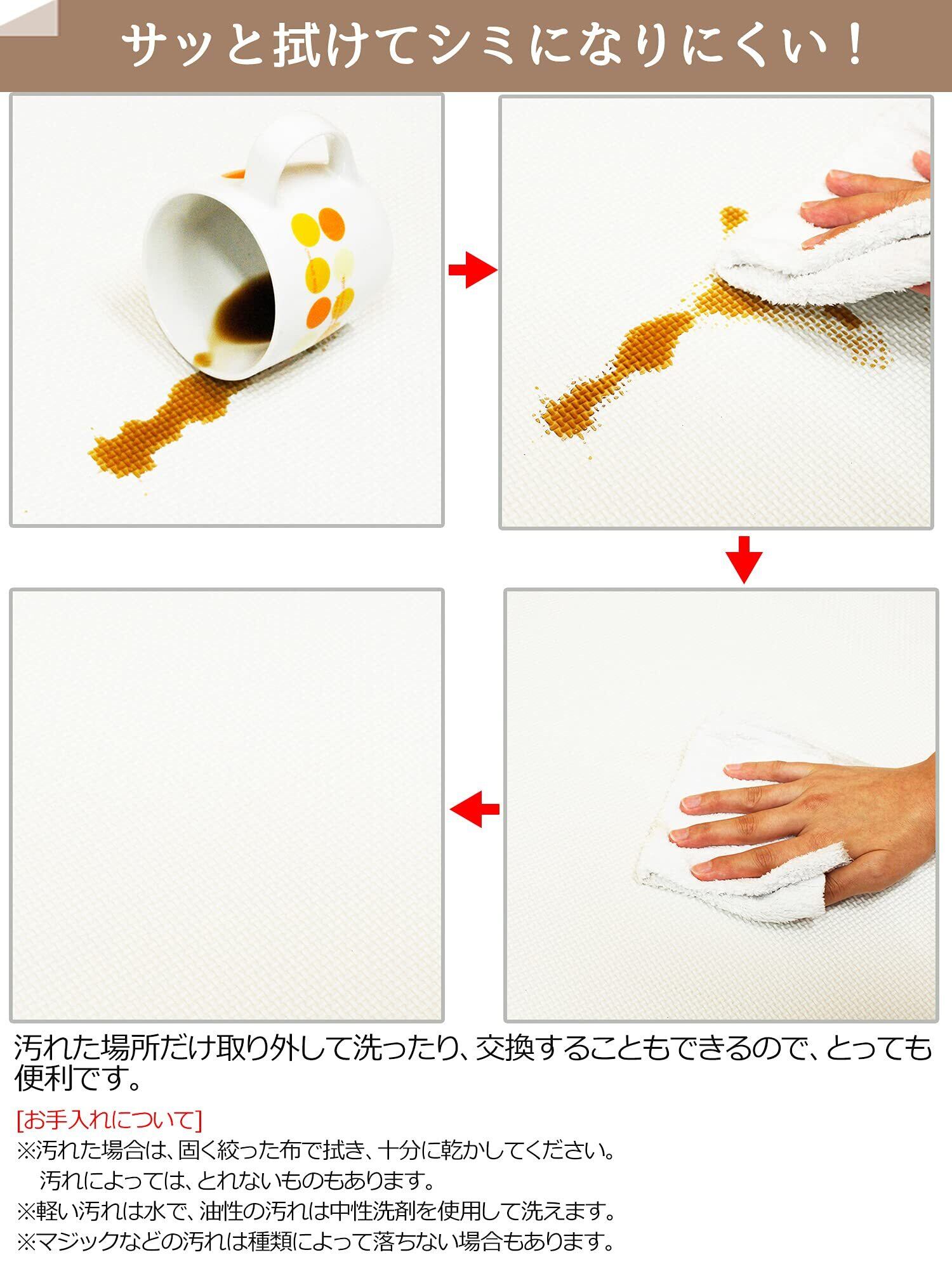EVA樹脂製のマットは、水拭きで簡単にお手入れができます。汚れた部分をサッと拭くだけで、清潔に保つことが可能です。また、床暖房にも対応しているため、冬でも快適にご使用いただけます。