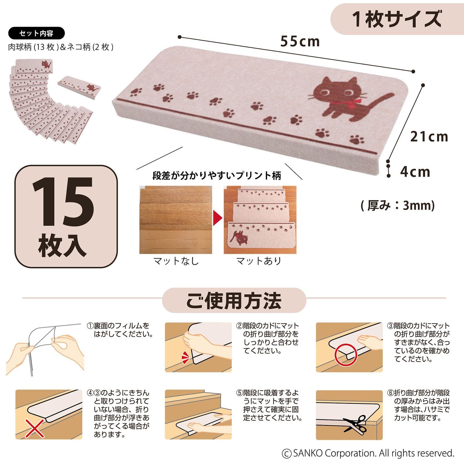 【数量限定】サンコー 階段マット ずれない 洗える 日本製 折り曲げ付 ネコ 猫 おくだけ吸着 55×21cm(折り曲げ55×4cm)15枚入 KD-57