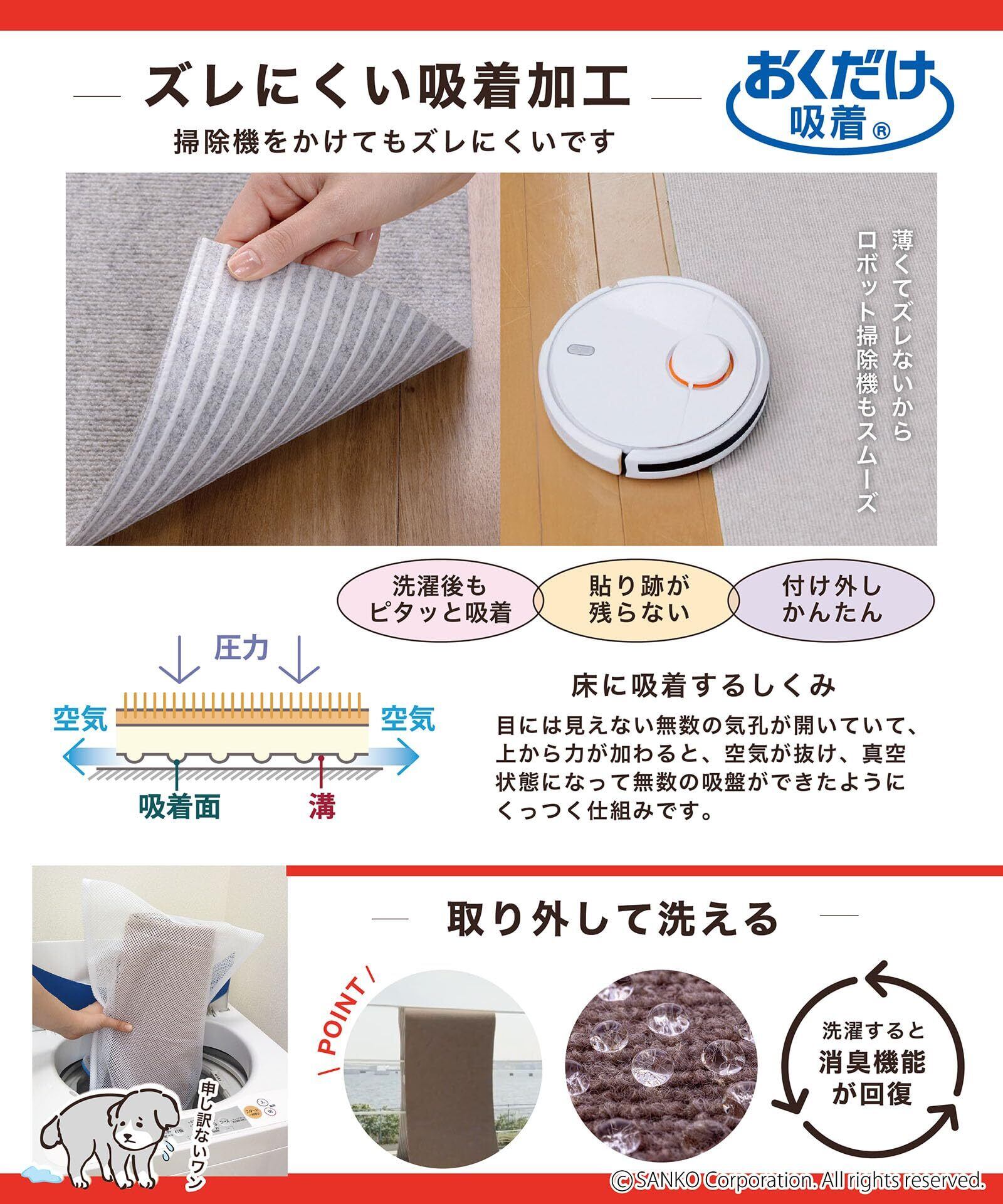 特徴:ズレない、洗える、日本製、おくだけ吸着、カーペットタイプ