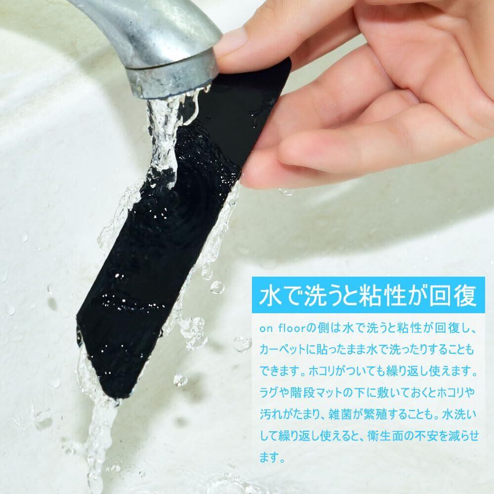 【繰り返し使える】on floorの側は水で洗うと粘性が回復し、カーペットに貼ったまま水で洗ったりすることもできます。ホコリがついても繰り返し使えます。ラグや階段マットの下に敷いておくとホコリや汚れがたまり、雑菌が繁殖することも。水洗いして繰り返し使えると、衛生面の不安を減らせます。