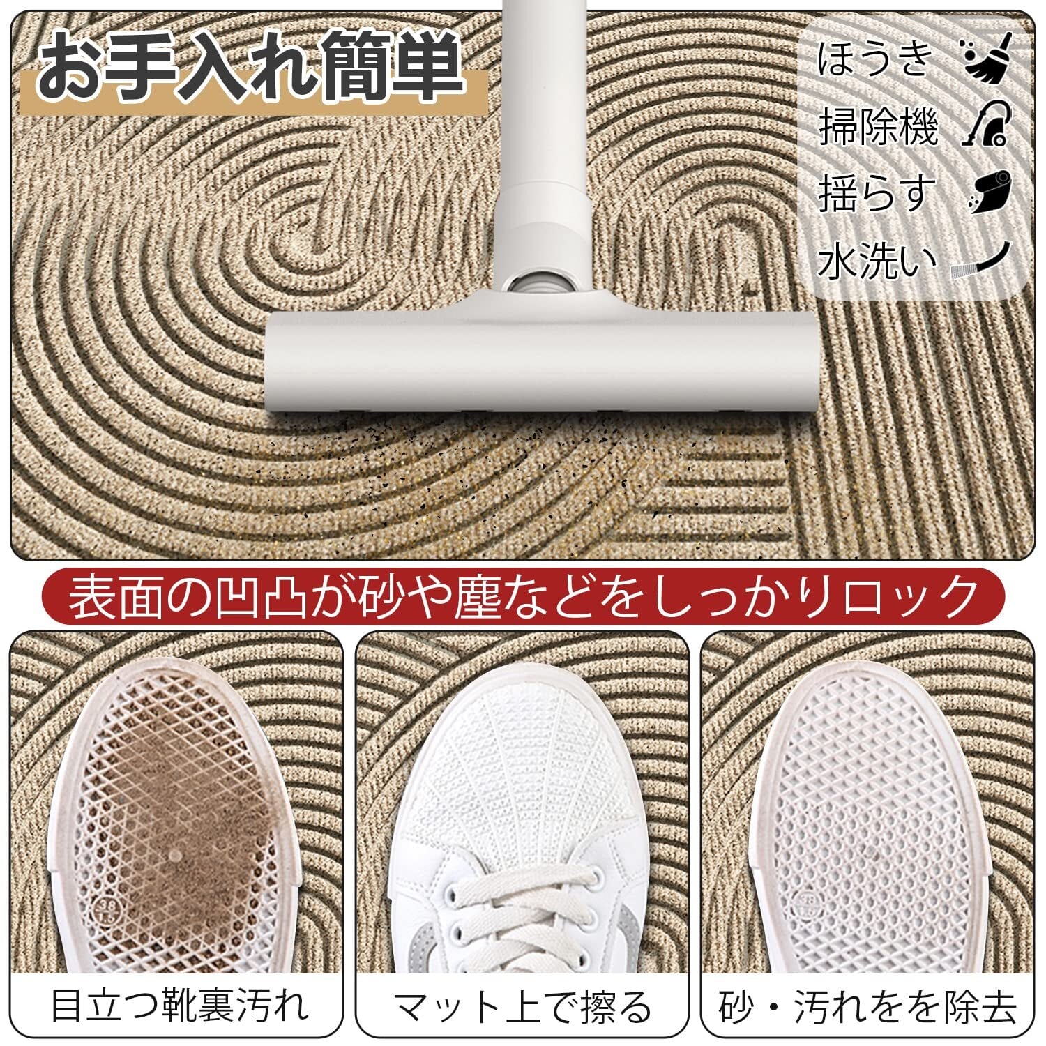 このマットは水洗いが可能で、泥や汚れがついても簡単にお手入れできます。手間いらずのメンテナンスで、常に美しい状態をキープ。忙しい日常の中でも、清潔感を損なうことはありません。