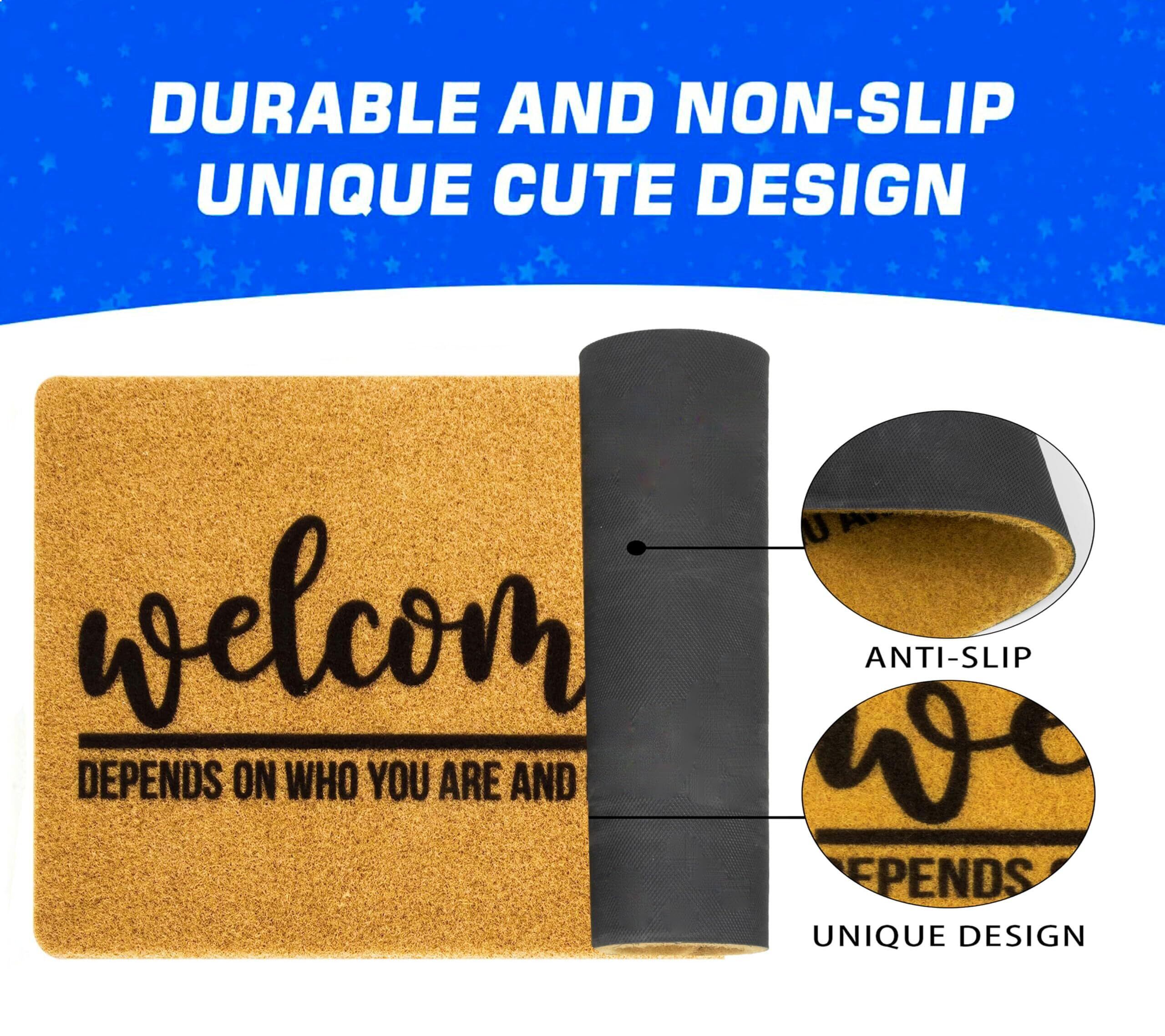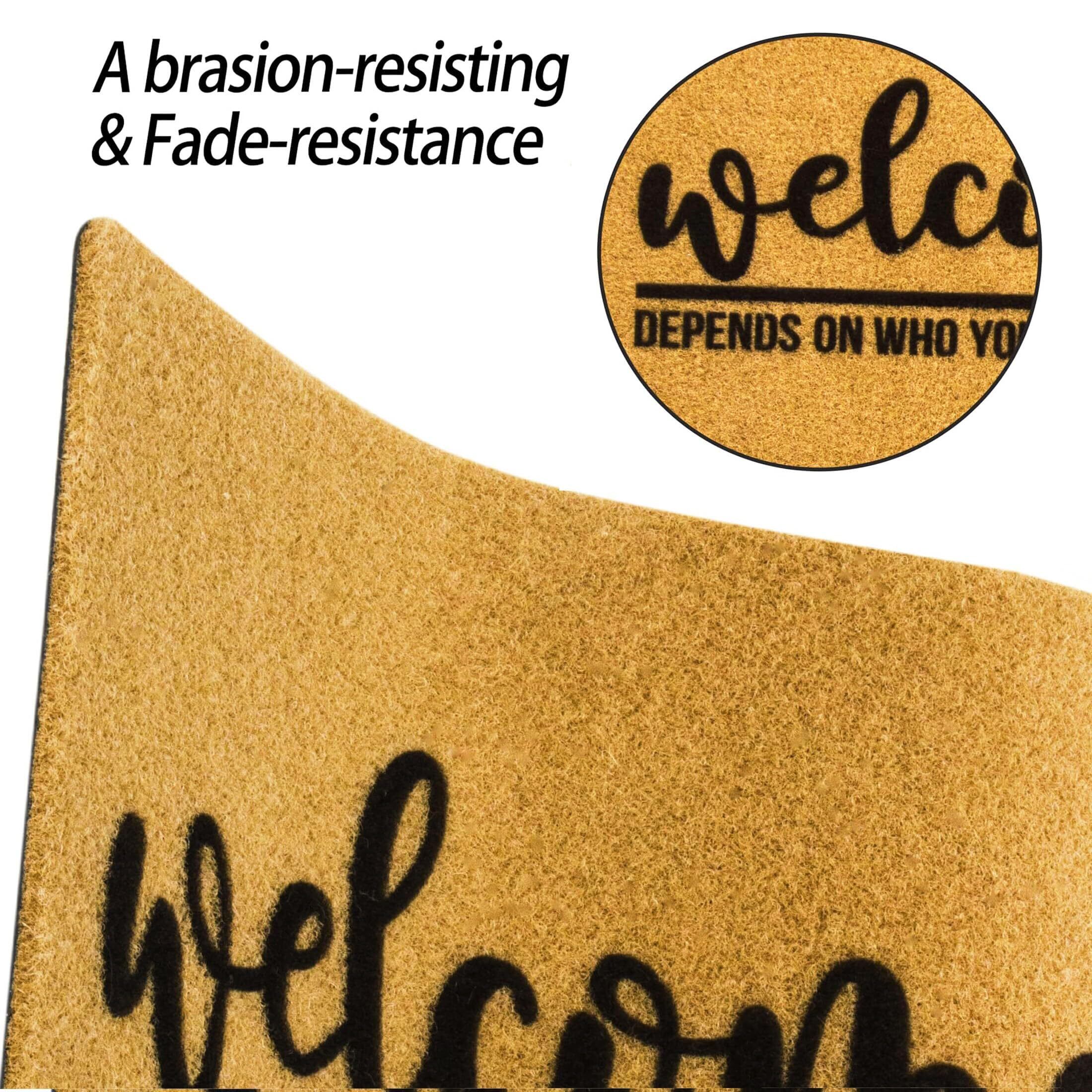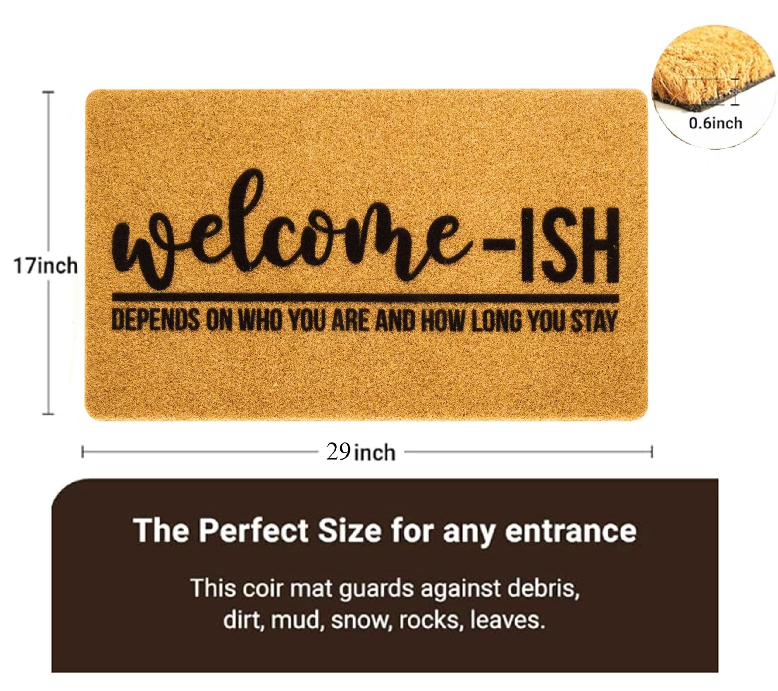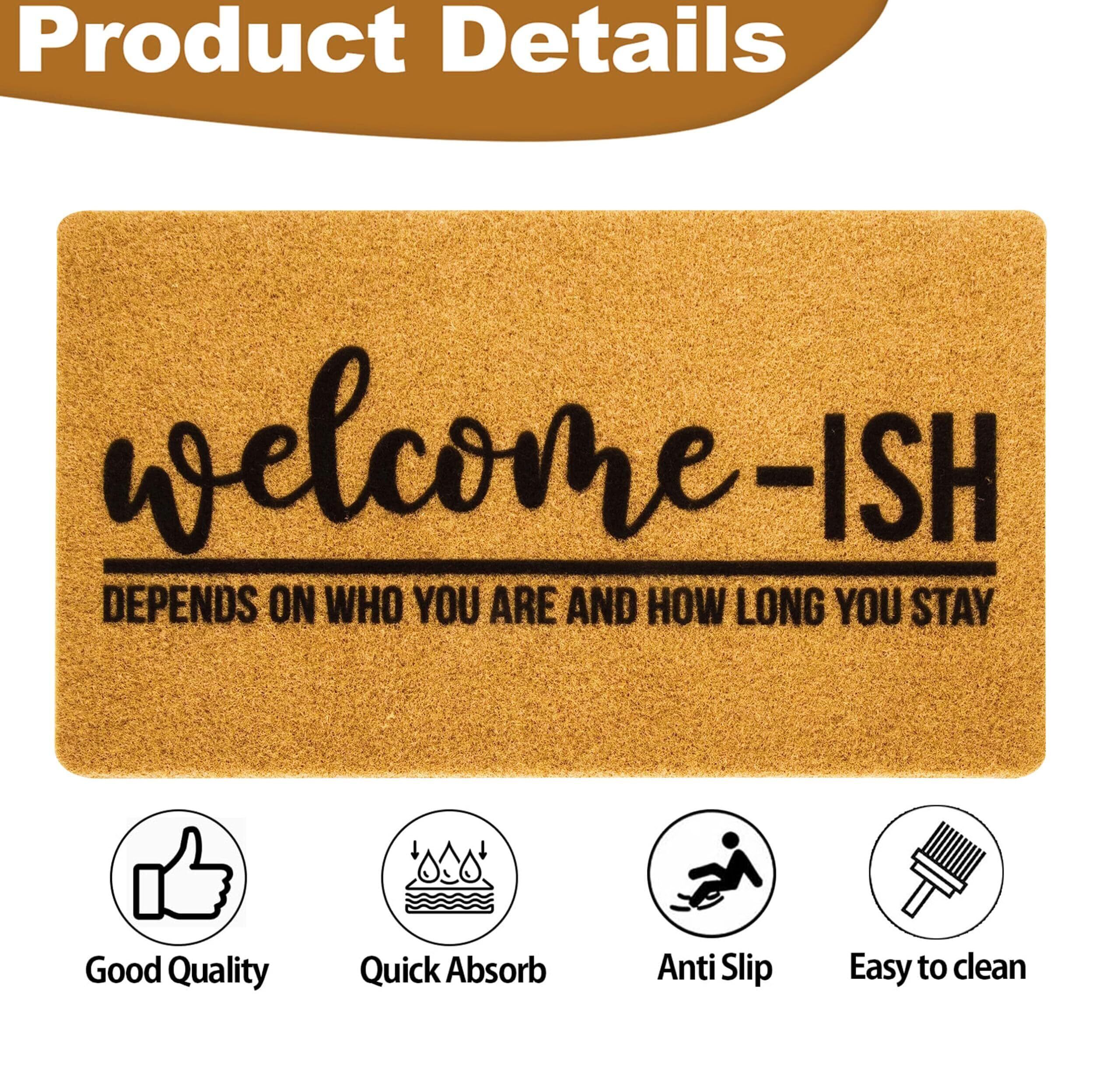 人工コイルファイバー:Welcome-Ish Depends Who You are Themeドアマットは高品質で頑丈で持続可能な人工コイアで作られており、裏面は滑り止め、フロントウェルカムドア装飾、屋外ドアマット屋外エントランス