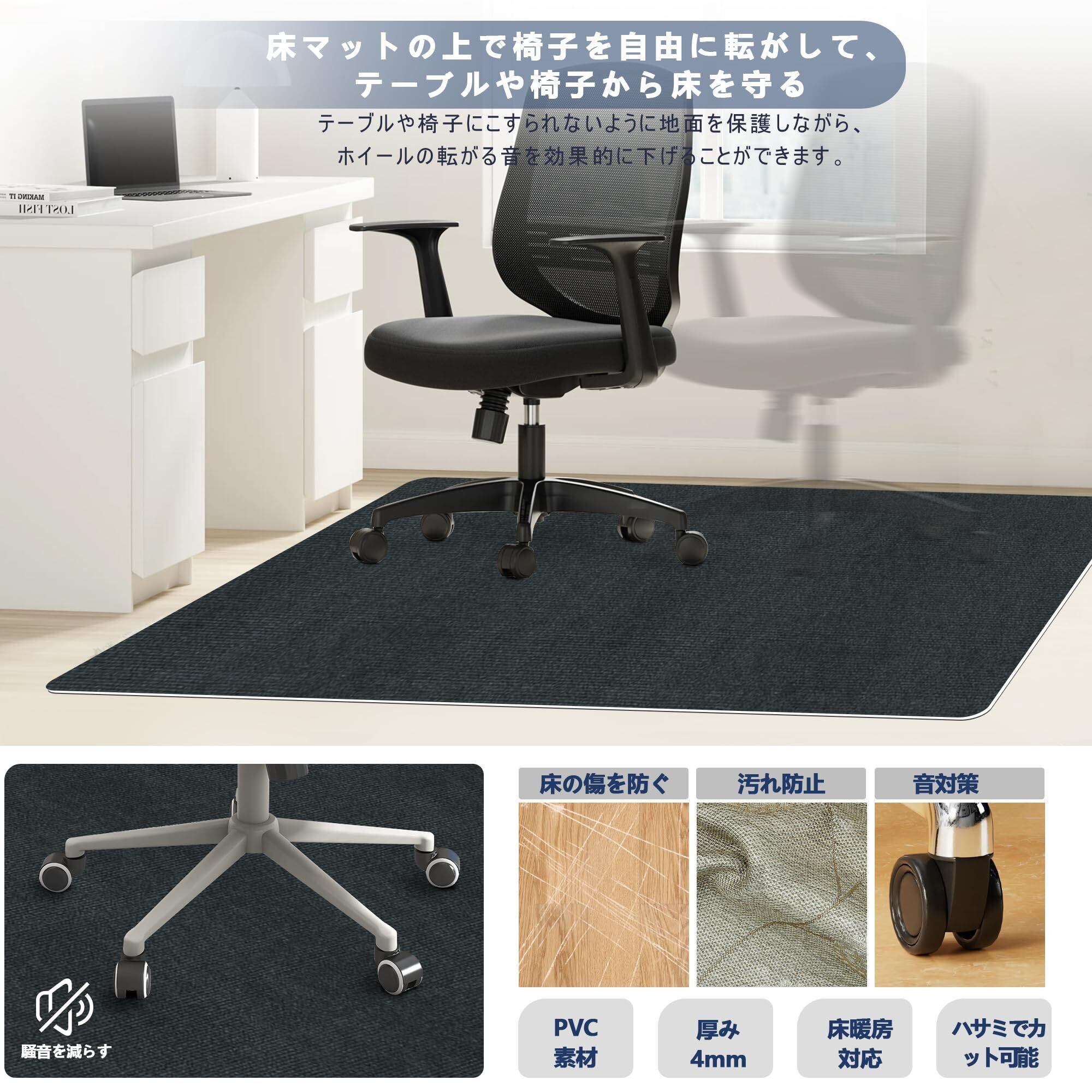 【騒音を軽減・傷防止デスクチェアマット】キャスターが移動する際に発生する音を効果的に吸収し、静かな生活環境を作り出します。厚さはわずか 4mm で、椅子の移動を一切妨げず、自由に動けます。