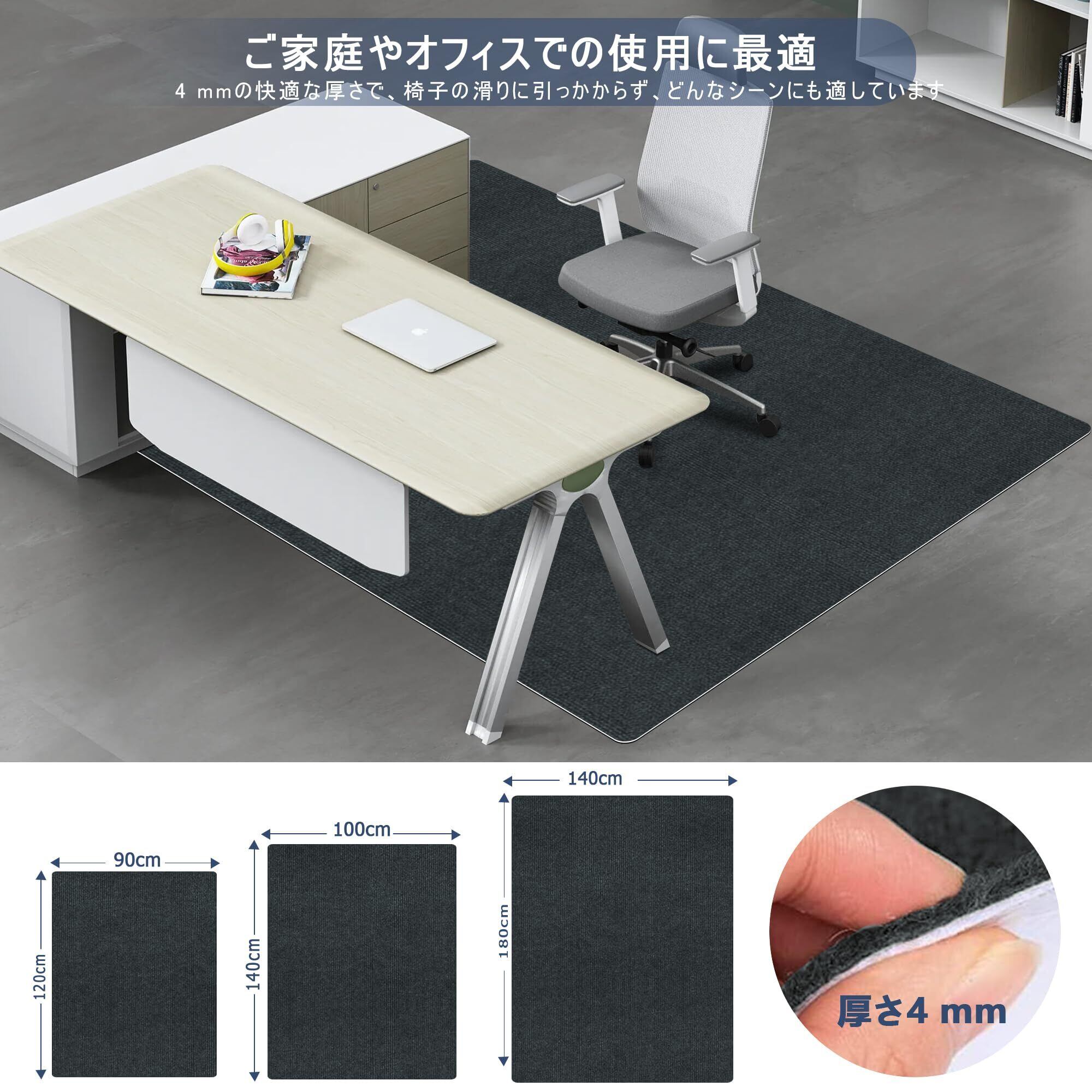【フリーカット&使いやすい】椅子マットのサイズは120×90 cm、140×100、160×140cm、180×140、厚さは4 mm。使うときは、実際の必要に応じてハサミやカッターで簡単に裁断することで、サイズや形を変えることができます。すべてのシーンに完璧にフィットします。