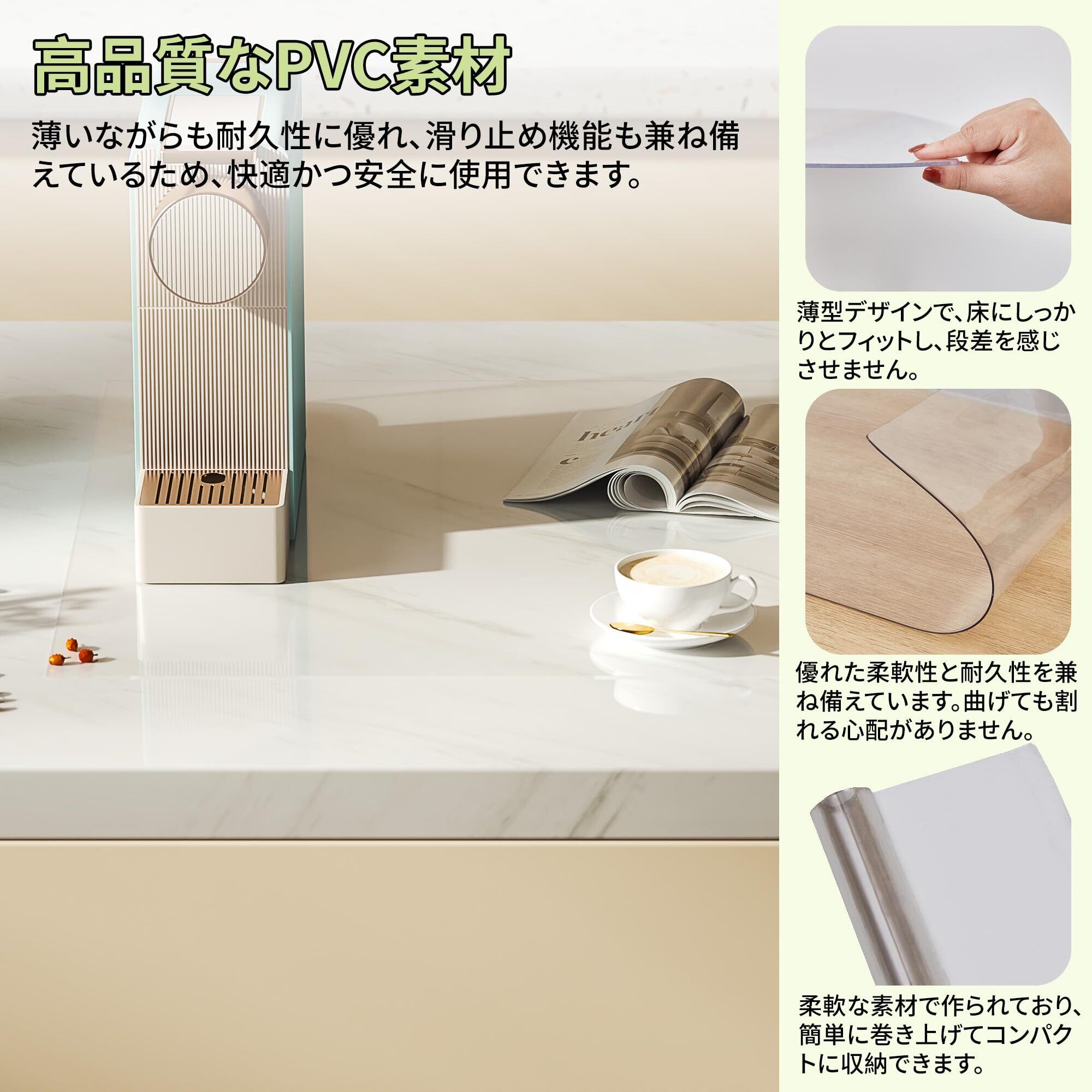 このフロアマットはインテリアを引き立てる透明なデザインで、どんな部屋にもマッチします。床の美しさを損なわず、シンプルで洗練された印象を与えます。