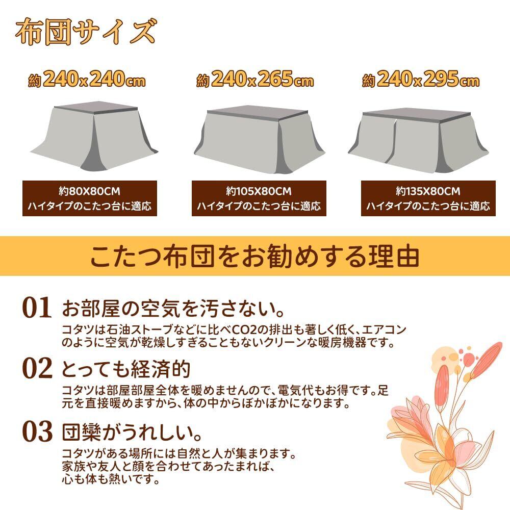 【商品サイズ】約240x295cm(キルティング加工許容範囲+5%-3%)【適応こたつ台】約80x135cmの高脚こたつ台対応