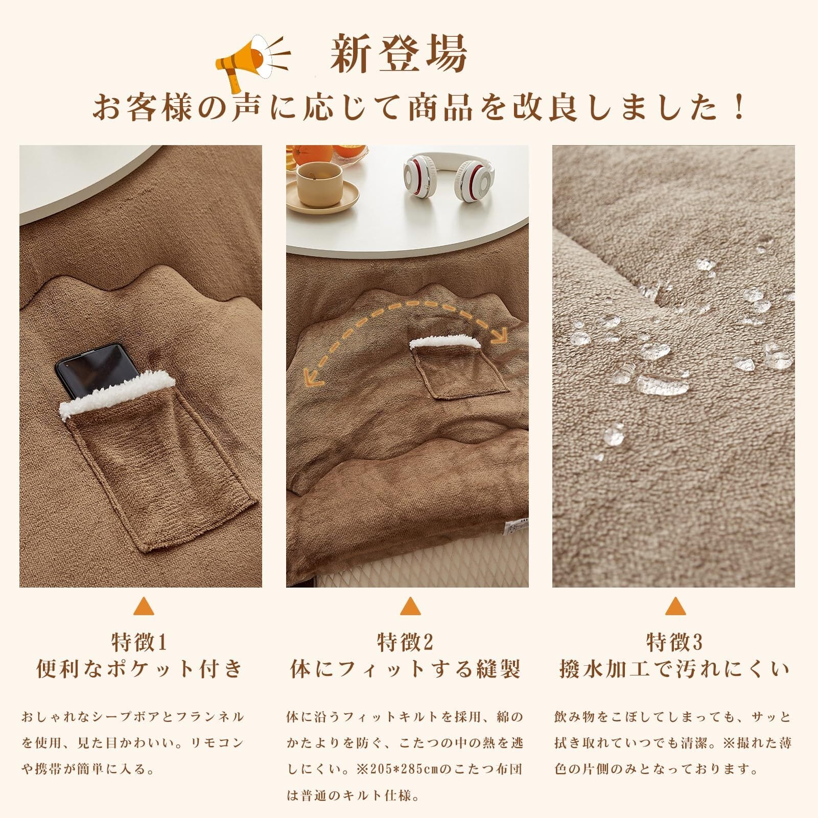 【便利なポケット付き】おしゃれなシープボアとフランネルを使用、見た目かわいい。リモコンや携帯が簡単に入る。【体にフィットする縫製】体に沿うフィットキルトを採用、綿のかたよりを防ぐ、こたつの中の熱を逃しにくい。【撥水効果で汚れにくい】飲み物をこぼしてしまっても、サッと拭き取れていつでも清潔。