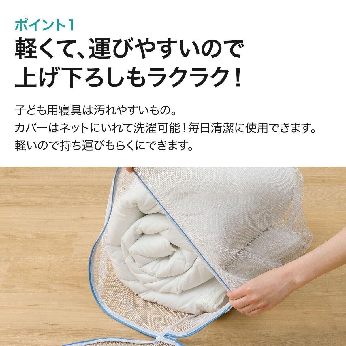 子ども用寝具は汚れやすいもの。カバーはネットにいれて洗濯可能。毎日清潔に使用できます。軽いので持ち運びもらくにできます。