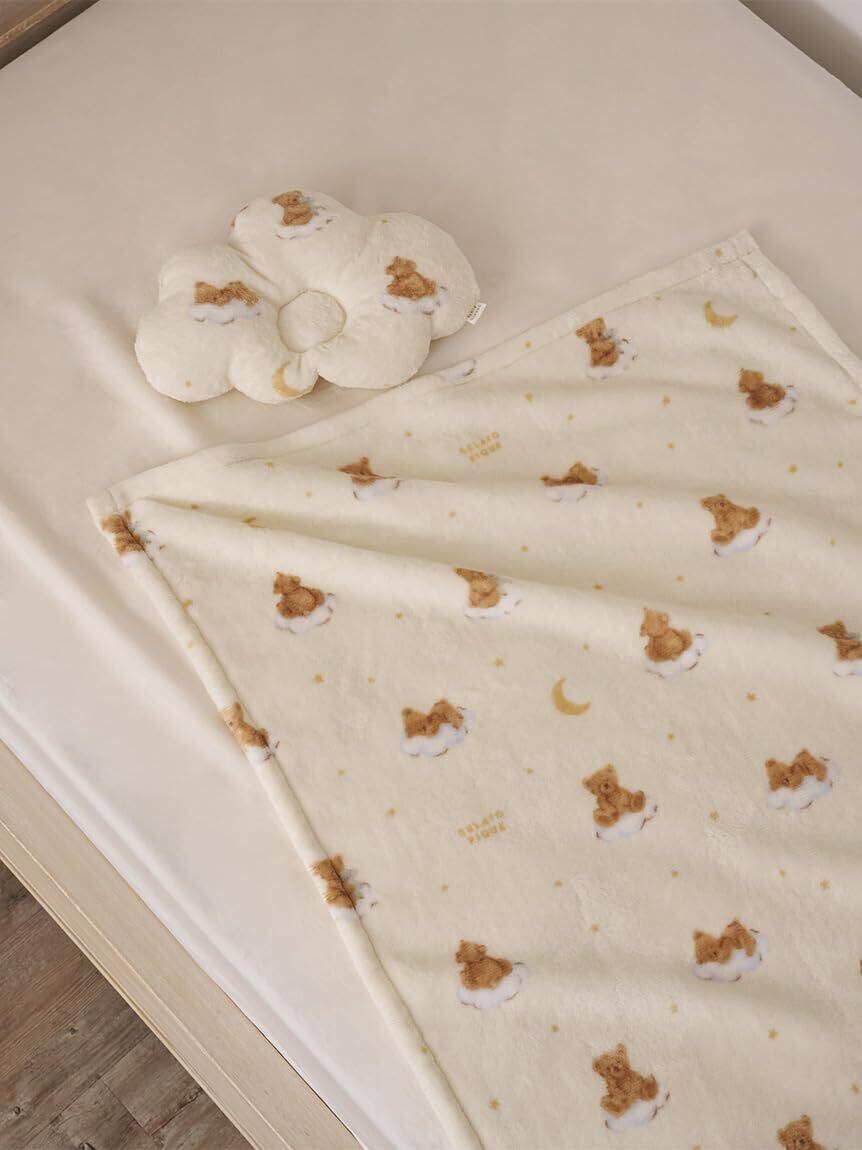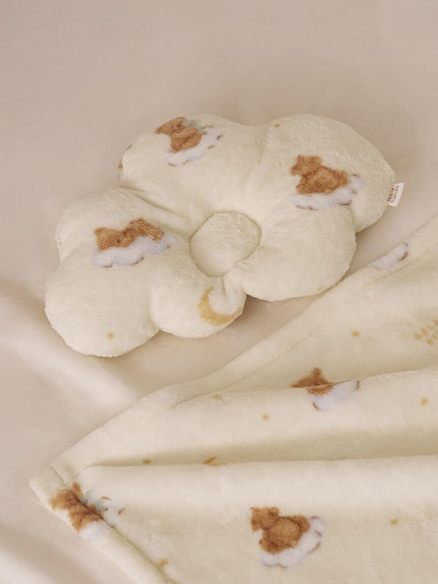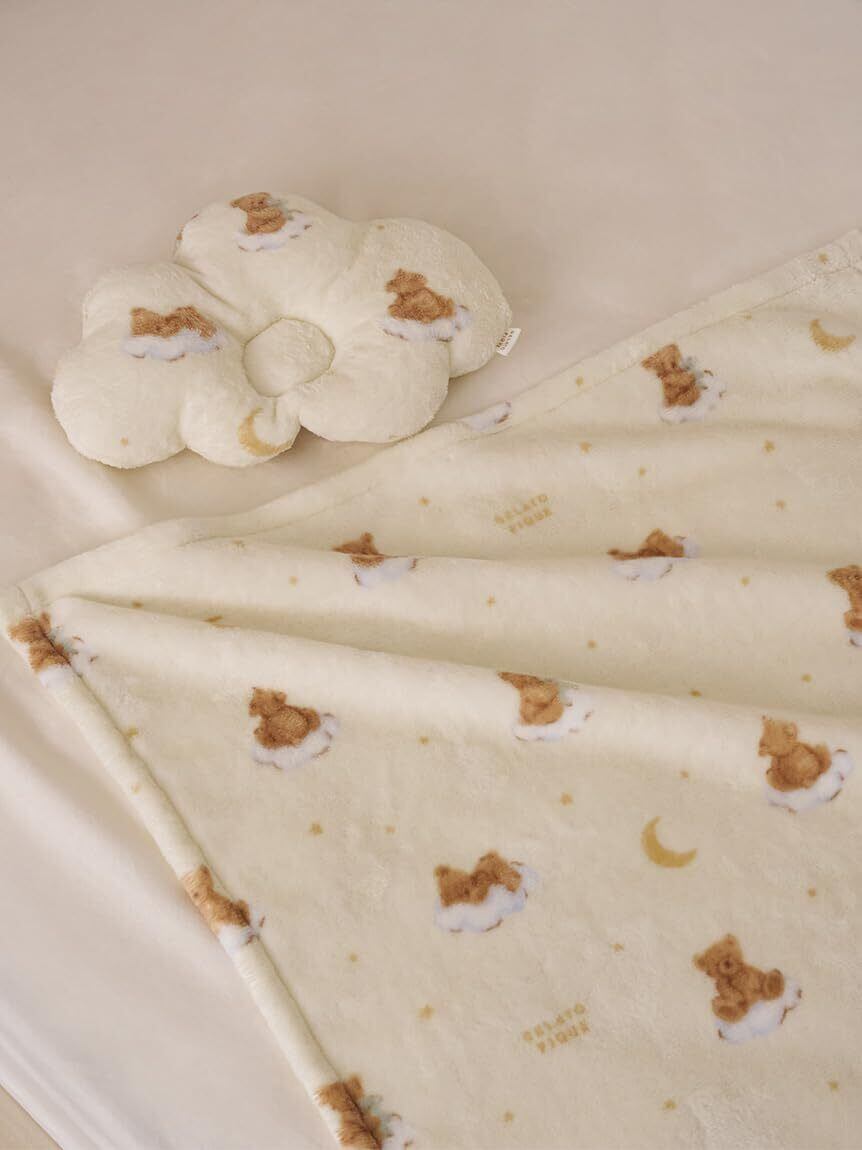 ふわふわの雲の上に描かれているのは、夜空をのんびり眺めたり、気持ちよさそうに眠るベアたち。柔らかな起毛素材で仕上げた、愛情たっぷりのベビーピローです。描かれている雲の柄と、ピローのシルエットが同じになっているのがこだわりポイント。同素材を使用した毛布と揃えたコーディネートもお楽しみいただけ、ギフトにもおすすめのアイテムです。