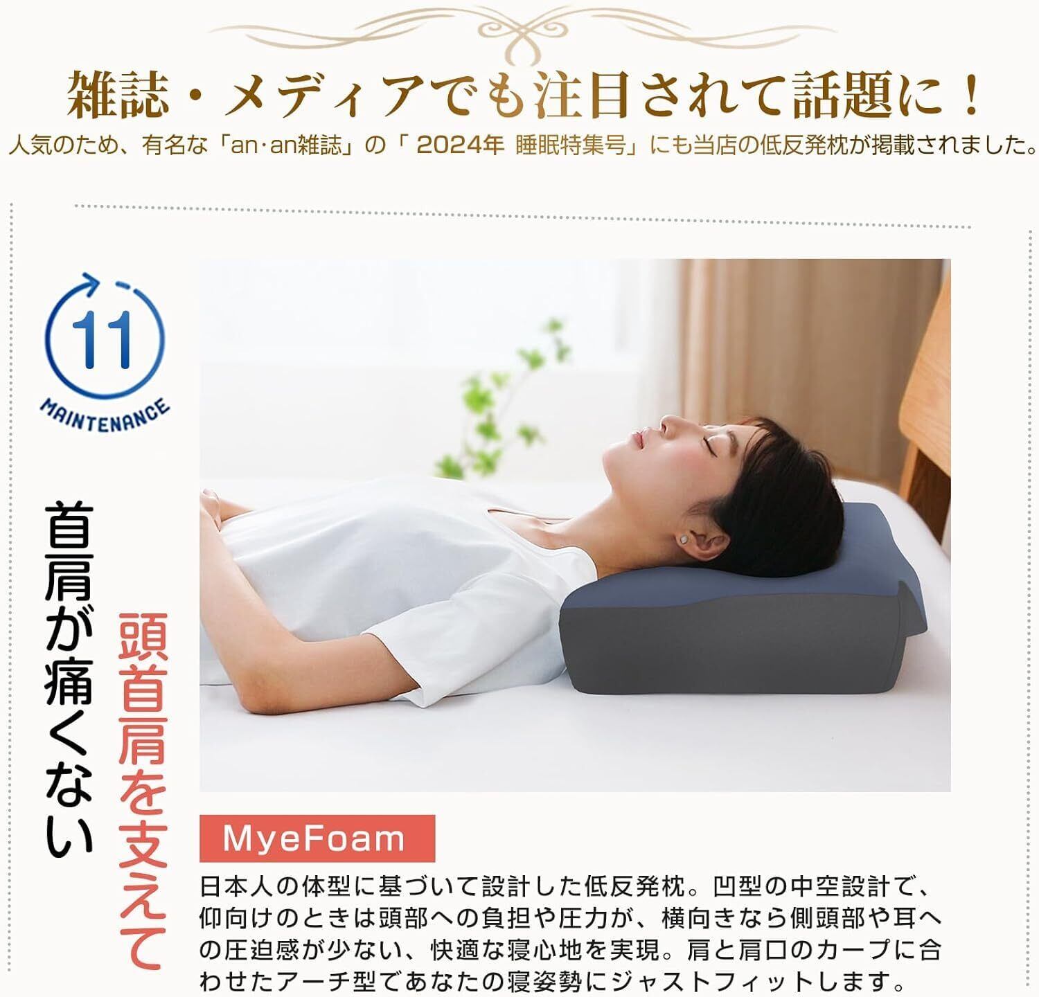 【首肩が痛くならない】有名な「an・an雑誌」の睡眠特集号にも当店の枕を紹介しました。日本人の体型に基づいて設計された低反発枕です。凹型の中空設計により、頭が安定し、頭部への負担をかけず、まるで無圧力のような寝心地を実現。横向き寝の際の側頭部や耳のあっぱく感も感じない。肩と肩口のカーブにフィットするアーチ型形状で頭をのせるだけで自然なカーブに導き、首や肩もラクなんです。
