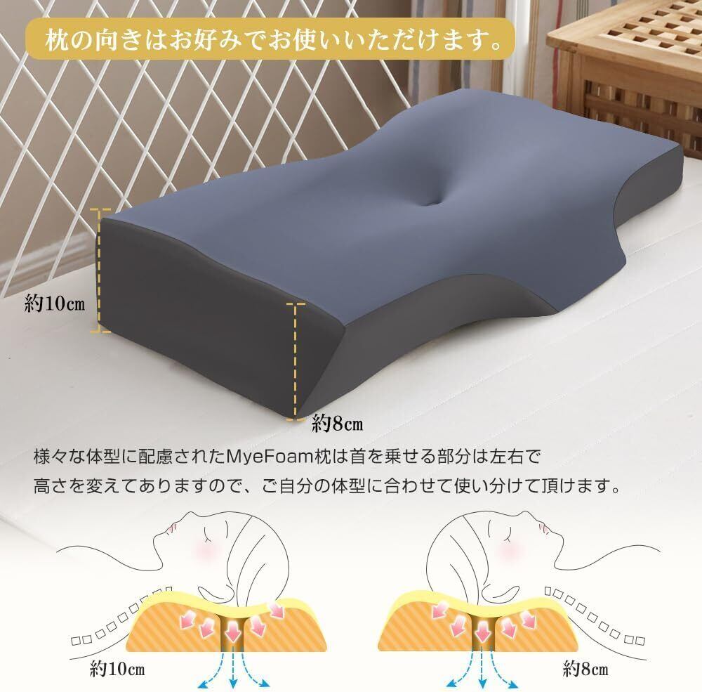 【仰向き 横向きでもラク、高さ調整可能】仰向けで寝る場合、中空設計+くぼみ形状により、頭部への圧力をかからず、寝姿勢を安定。 横向けで寝る場合、中空設計で横向き寝の際の側頭部や耳のあっぱく感を感じない。 様々な体型に配慮されたMyeFoam枕は首を乗せる部分は左右で高さを変えてありますので、ご自分の体型に合わせて使い分けて頂けます。