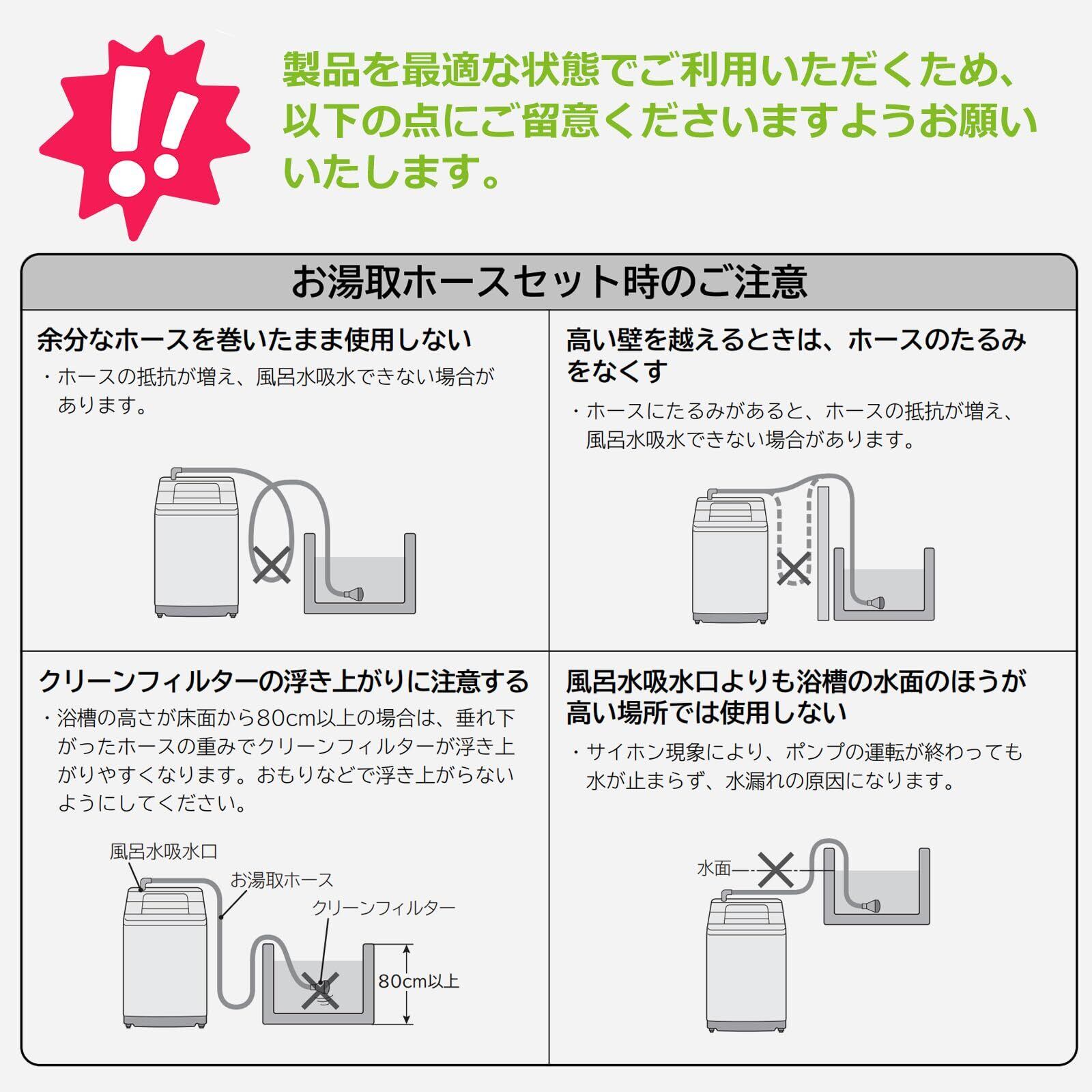 このホースセットには高性能フィルターが付いており、水道水だけでなく風呂水の不純物をしっかりキャッチします。フィルターによって清潔な水を使用することで、衣類をより丁寧に洗うことができます!