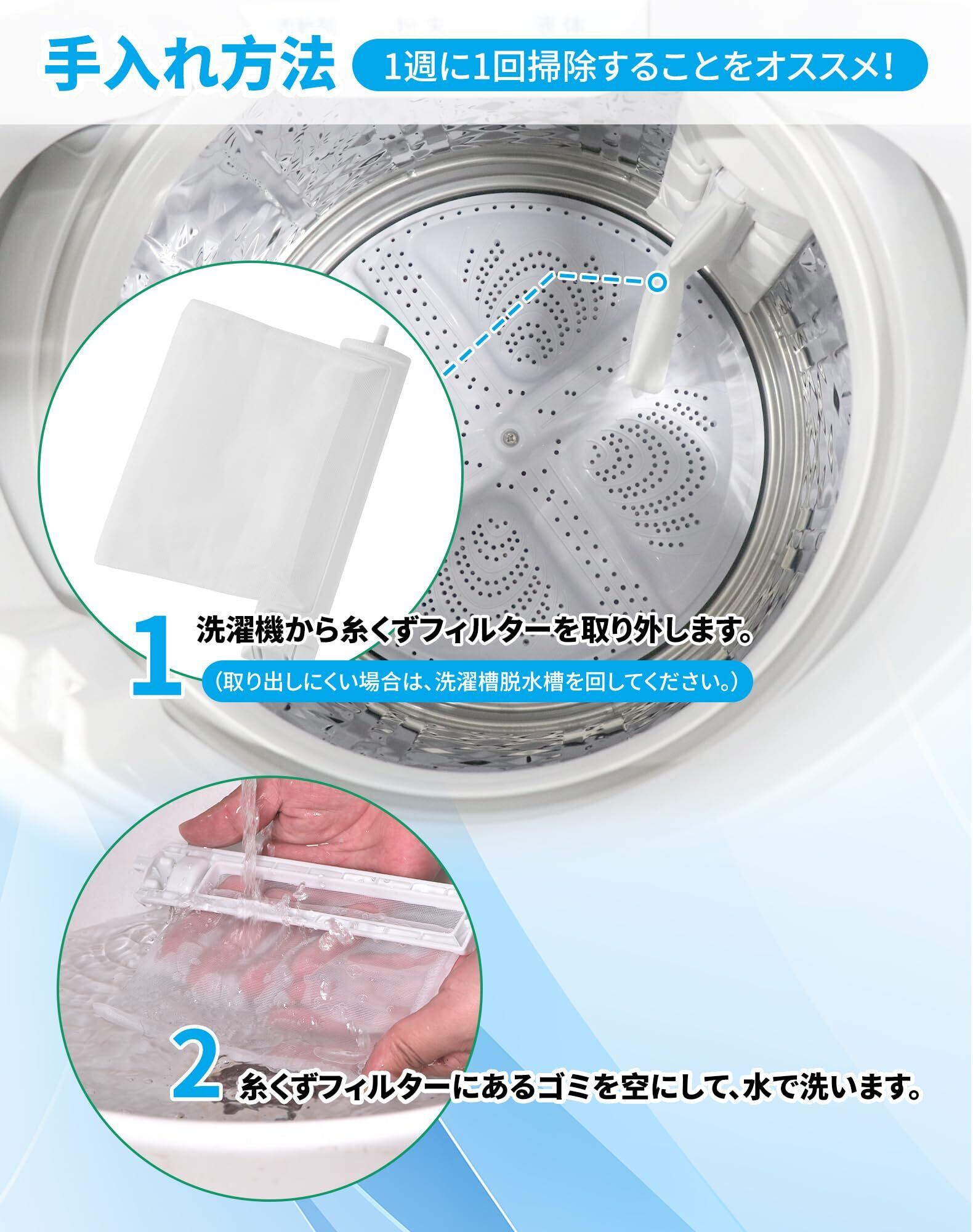 【注意事項】洗濯物をきれいに保つために、洗濯機の使用頻度によって、洗濯機用糸くずフィルターは、少なくとも1週間を目安に定期的に洗濯してください。洗い方: (1) 洗濯機から糸くずフィルターを取り出します。(取り出しにくい場合は、洗濯槽脱水槽を回して下さい)。 (2) 糸くずフィルターを空にして、水ですすぎます。 (3) 糸くずフィルターを洗濯機にセットします。