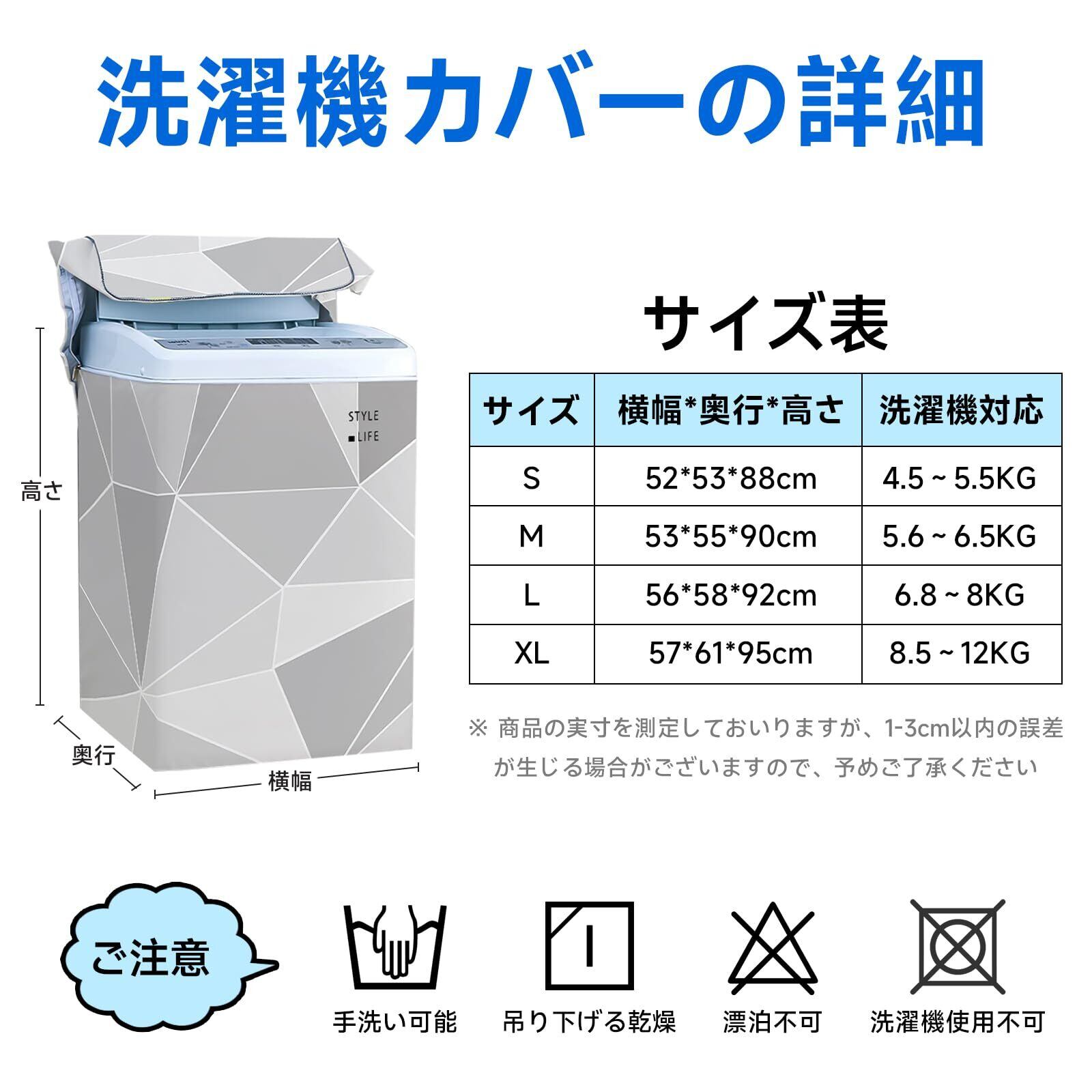 【安心使用・品質管理】洗濯機のサイズによって、3つの異なるサイズの洗濯機カバーを用意しています。お洗濯機のサイズに合わせて、適切なサイズの洗濯機カバーを選ぶことをおすすめします。また、安心してご使用いただけるように、6ヶ月間の期間を提供しています。万が一不具合や故障が発生した場合は、お気軽にお問い合わせください。
