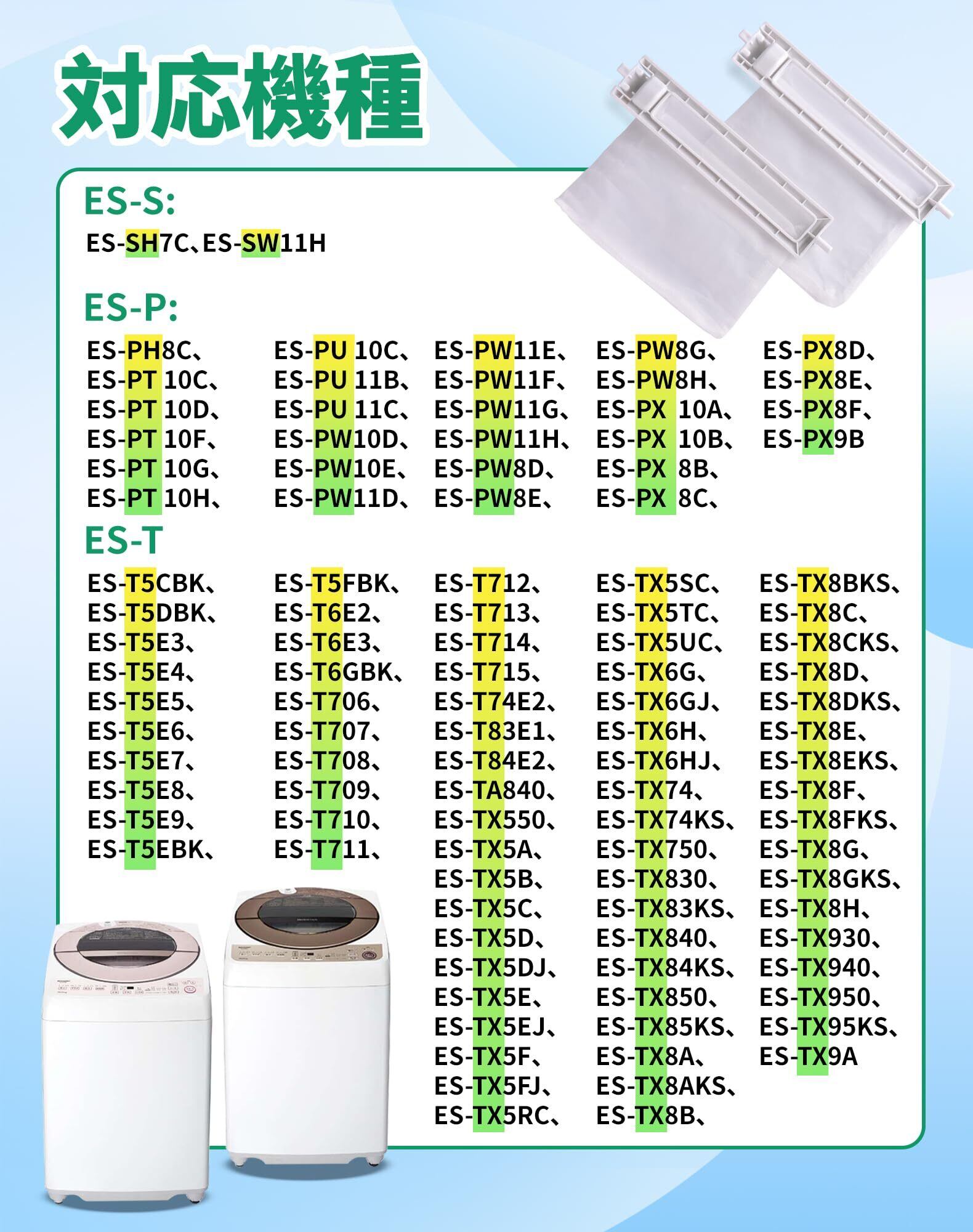 このフィルターは、ES-LP1およびES-LP2など、数多くの縦型洗濯機に対応しています。機種に合わせた選択ができ、オンラインで手軽にご購入いただけますので、必要なときにすぐにフィルター交換が可能です。
